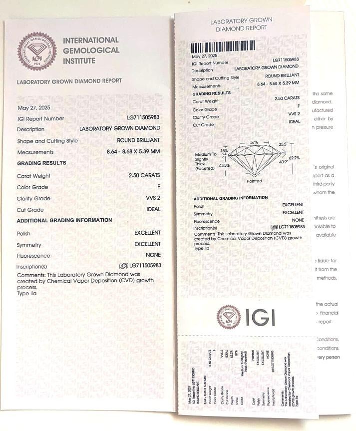 This 2.5 Ct Sparkling VVS2 Certified White F Lab Grown Diamond Is A Brilliant Round Cut. It Measures 8.64 x 8.68 x 5.39 mm. It is Eye Clean Bursting Out with a Full Spectrum of Colors. This Lab Grown Diamond has the Exact Chemical Compounds as a Mined From The Earth Diamond. So It Measures a Perfect 10 on the Mohs Hardness Scale . This fine Lab Grown Diamond will test positive for an earth mined diamond on any diamond tester. In addition the Lab Grown Diamond is Earth Friendly and Conflict Free, Not to mention it has all the beauty and characteristics of a natural diamond at only a fraction of the cost. The Lab Grown Diamond Really Is A "Brilliant Choice" !!! Please See IGI Certification For Further Details.