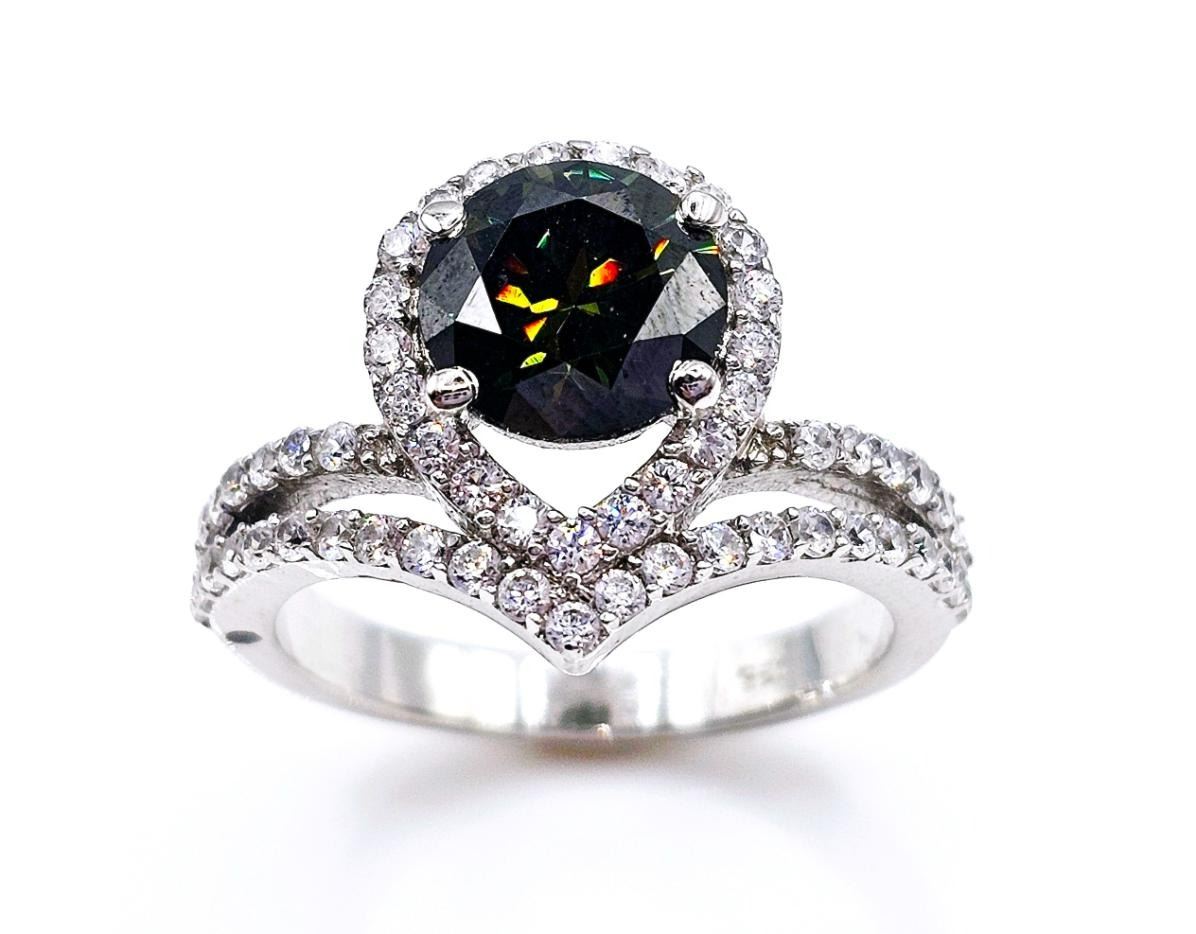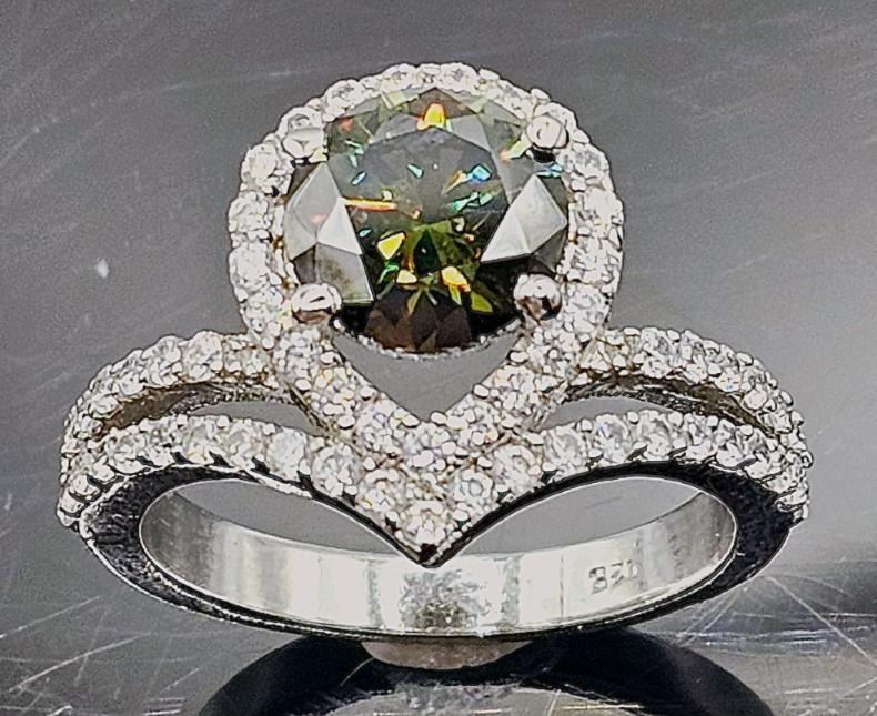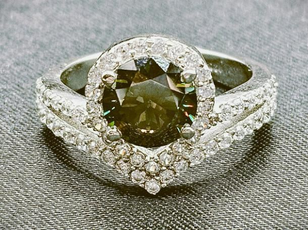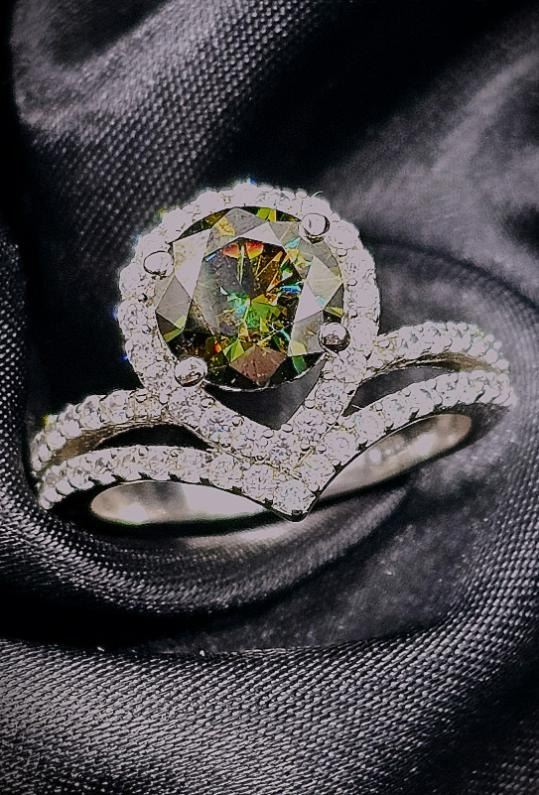 This VVs1 2.5 Ct Lab Simulated Diamond Centerstone Solitaire is a Brillant Round Cut Measuring approx 8.mm. The color is Golden Amber Green It is eye clean and bursting out with a full spectrum of colors. It Is Mounted In Tri-Layered 14 Kt White Gold over Solid .925 Sterling Silver which gives this ring its high polish and shine. With a 9.25 to 9.5 rating on the mohs hardness scale this simulated diamond will test positive for a diamond with almost any diamond tester.***It is also earth friendly conflict free***. Ring size 7.25 The total weight is approx. 3.6 grams. Simply Gorgeous!!!