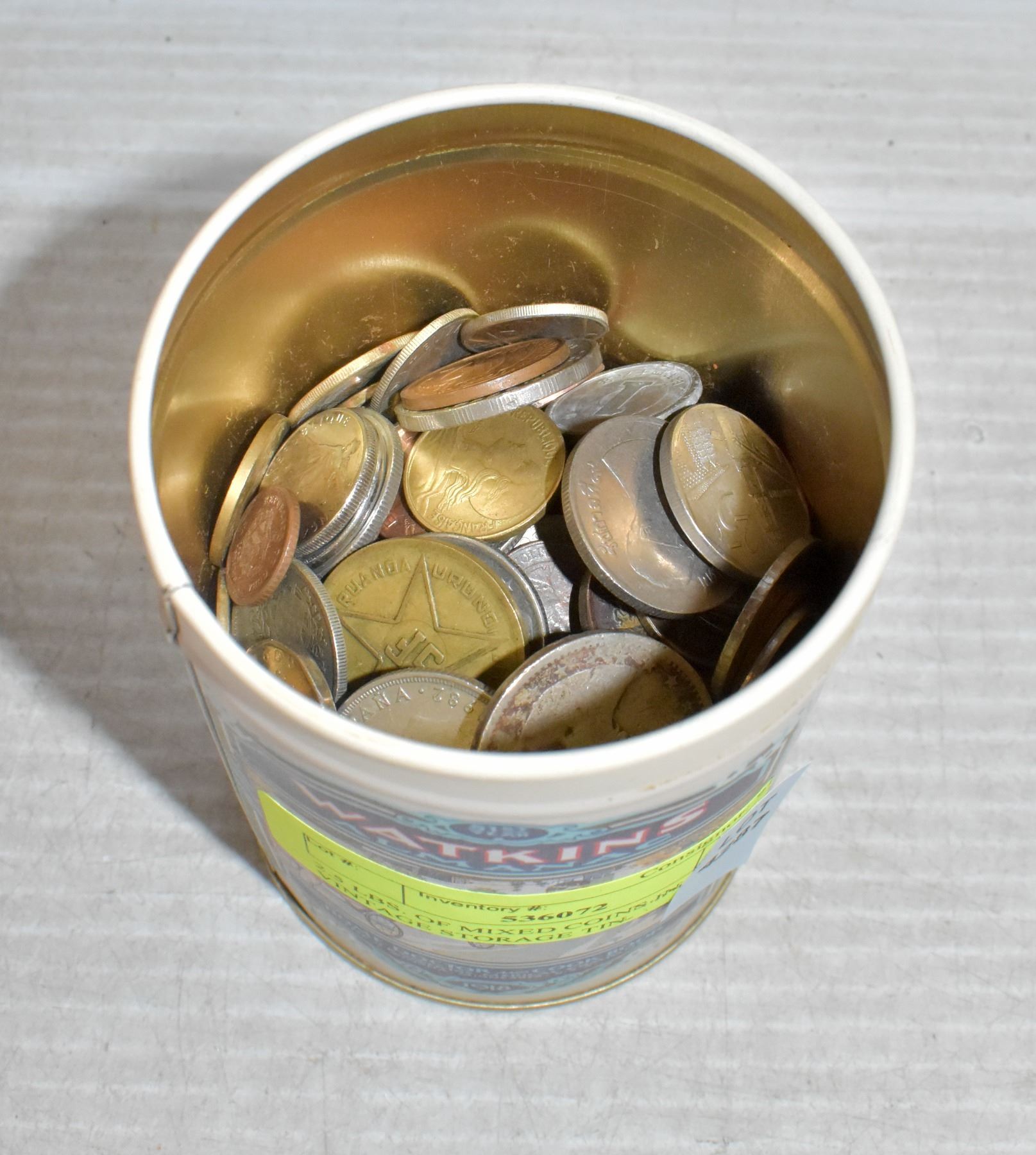 2.5 LBS. OF MIXED COINS IN VINTAGE STORAGE TIN.