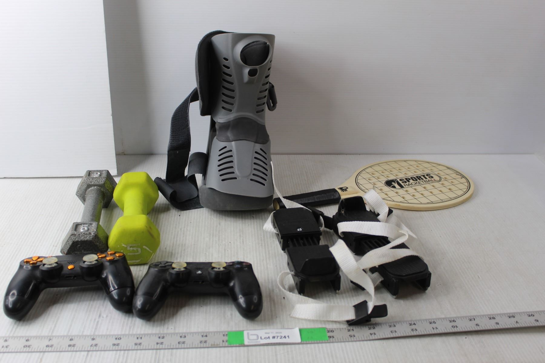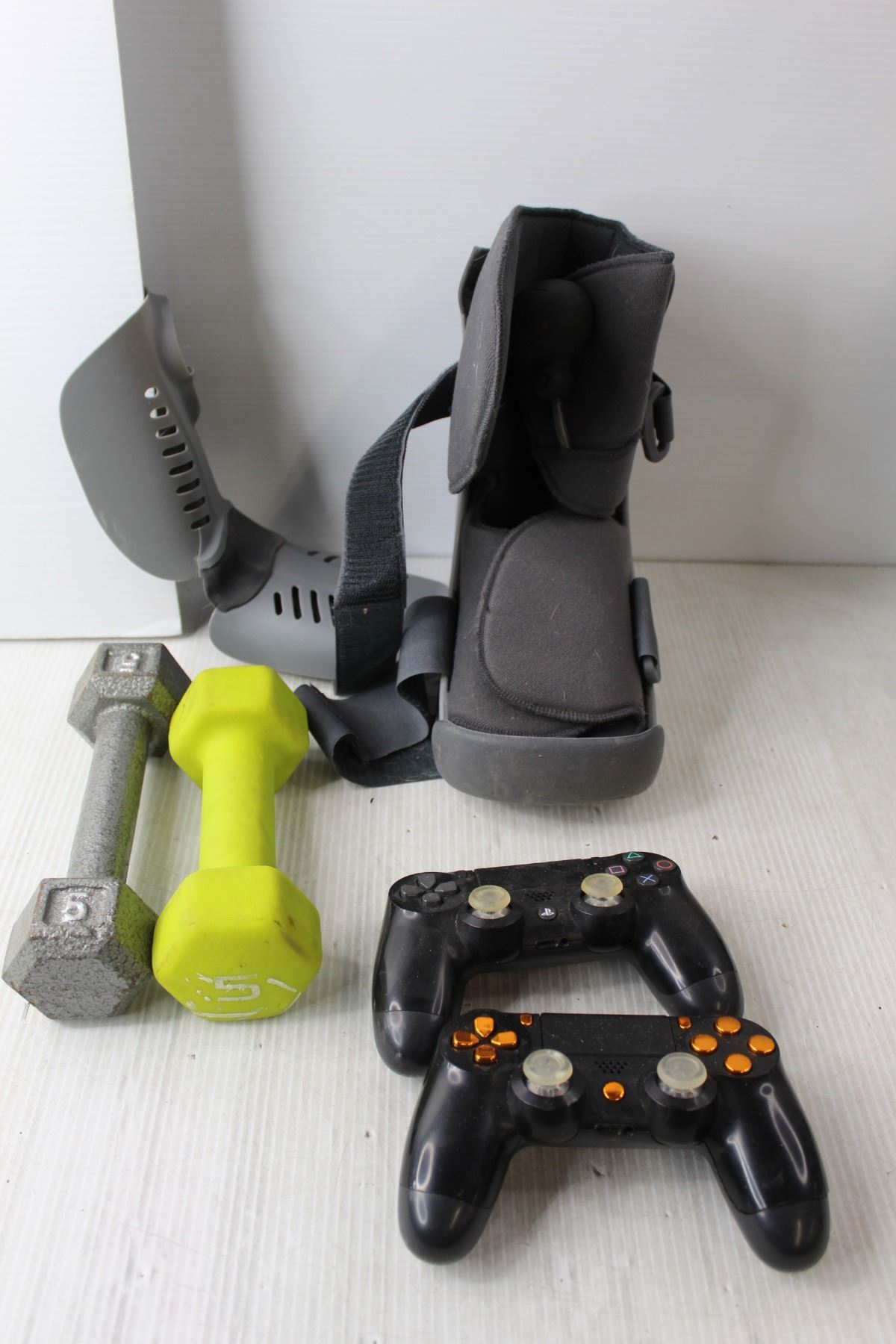 (2) 5 Lb. Weights, Ossur Orthopedic Boot, Racketball Racket, Misc.