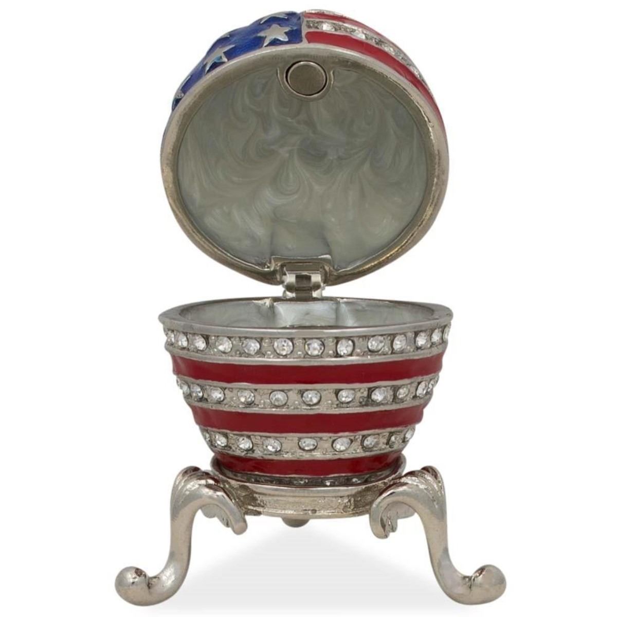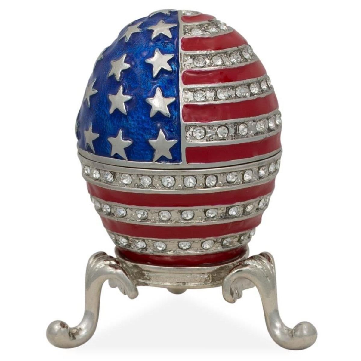 USA Flag Enameled Jeweled Faberge Inspired Egg This sparkling egg is adorned with clear crystals and high-polished enamel with silver trim. The egg opens opens on a hinge and closes shut with a magnet, to keep the box securely shut. The piece comes in a beautiful gift box. 2.5'' (H) Pewter, Crystals, Enamel Gift Boxed Faberge Eggs have a remarkable story and while the original Faberge eggs are virtually priceless, extraordinary re-creations of Carl Faberge’s works are not only fabulous to look at but wonderful to own and collect. You ask the question, “how much would an original Carl Faberge egg cost in today’s marketâ€. Here’s a story that will give you that answer: Los Angeles Times: “A Faberge egg found at a flea market by a scrap-metal dealer who initially didn't realize the value of what he had discovered will be on public view for the first time in more than a century, according to a British art and antiques dealer. The egg, thought to have been made in the late 19th century for Russian royalty, was purchased years ago at a U.S. flea market for just $14,000, said the antiques dealer, Wartski. The buyer was interested in the item for its gold content but later suspected the piece might be even more valuable. The egg was later sold to a private collector. The identities of the buyer and seller haven't been revealed. Wartski didn't disclose how much was paid for the egg, but some estimates put its value as high as $33 million. It will be on display at Wartski in London from April 14 to 17.†The first Faberge egg was crafted for Tsar Alexander III, who had decided to give his wife, the Empress Maria Fedorovna, an Easter egg in 1885, possibly to celebrate the 20th anniversary of their betrothal. Although there is no official record of the Tsar's inspiration for it, many believe that he was moved by an egg owned by the Empress’s aunt, Princess Vilhelmine Marie of Denmark, which had captivated Maria’s imagination in her childhood and of which the Tsar was well aware. Known as the Hen Egg, the very first Faberge egg is crafted from a foundation of gold. Its opaque white enameled "shell" opens to reveal a matte yellow-gold yolk. This in turn opens to reveal a multicolored gold hen that also opens. The hen contained a minute diamond replica of the imperial crown from which a small ruby pendant was suspended, but these last two elements have been lost.[2] Maria was so delighted by the gift that Alexander appointed Faberge a "goldsmith by special appointment to the Imperial Crown" and commissioned another egg the next year. After that, Peter Carl Faberge was apparently given complete freedom for the design of future imperial Easter eggs, and their designs became more elaborate. According to Faberge family lore, not even the Tsar knew what form they would take—the only requirements were that each contain a surprise, and that each be unique. Once Faberge had approved an initial design, the work was carried out by a team of craftsmen, among them Michael Perkhin, Henrik Wigstrom and Erik August Kollin.[citation needed] After Alexander III's death on 1 November 1894, his son, Nicholas II, presented a Faberge egg to both his wife, Alexandra Fedorovna, and his mother, the Dowager Empress Maria Fedorovna. Records have shown that of the 50 imperial Easter eggs, 20 were given to the former and 30 to the latter. Eggs were made each year except 1904 and 1905, during the Russo-Japanese War.[3] The imperial eggs enjoyed great fame, and Faberge was commissioned to make similar eggs for a few private clients, including the Duchess of Marlborough, the Rothschild family and the Yusupovs. Faberge was also commissioned to make twelve eggs for the industrialist Alexander Kelch, though only seven appear to have been completed.[1] Following the revolution and the nationalization of the Faberge workshop in St. Petersburg by the bolsheviks in 1918, the Faberge family left Russia. The Faberge trademark has since been sold several times and several companies have retailed egg-related merchandise using the Faberge name. The Victor Mayer jewelry company produced limited edition heirloom quality Faberge eggs authorized under Unilever's license from 1998 to 2009. The trademark is now owned by Faberge Limited, which makes egg-themed jewellery.[4] In 2015 the owners of this trademark announced the creation of a new "Faberge" egg, one styled by them as belonging to the "Imperial Class" of eggs and therefore the first Imperial-Class egg in 100 years: the Faberge Pearl egg is to be sold in Qatar following a five-day exhibition some time in 2017. A spokesperson for the brand said it expected the egg to fetch at least two million US dollars, possibly much more. Despite its designation as "Imperial", it has no connection to Imperial Russia and instead has become closely tied to wealthy Arab ruling families of various Gulf Nations.[5] Its motif has been described as "scalloped", but the patterns of its curves and lines are also clearly derived from the girih and arabesque of Islamic interlace patterns, and each of its six vertical segments includes a stylized pointed dome and associated pendentives reminiscent of the onion dome and ceiling of an Arabic mosque. The celebrated series of 50 Imperial Easter eggs was created for the Russian Imperial family from 1885 to 1916 when the company was run by Peter Carl Faberge. These creations are inextricably linked to the glory and tragic fate of the last Romanov family. They were the ultimate achievement of the renowned Russian jewelry house and must also be considered the last great commissions of objets d’art . Ten eggs were produced from 1885 to 1893, during the reign of Emperor Alexander III; 40 more were created during the rule of his dutiful son, Nicholas II, two each year, one for his mother, the dowager, the second for his wife. The series began in 1885 when Emperor Alexander III, through the intermediary of his uncle, Grand Duke Vladimir, commissioned an Easter
