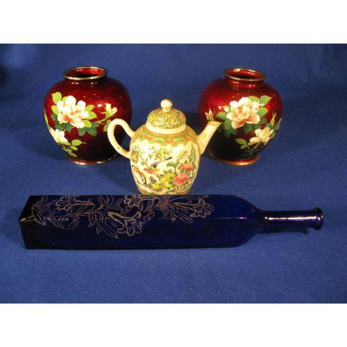 2- 5" porcelain over brass vases, teapot, chipped, cobalt bottle, etched