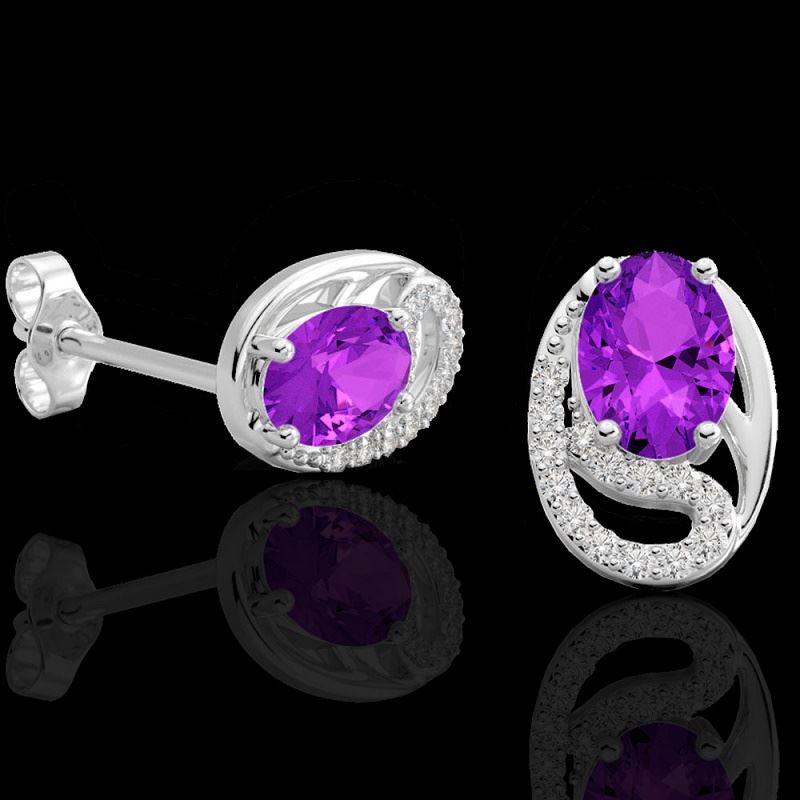 REF-25N6Y -22323 ---- 2.50 Amethyst & Micro Pave VS/SI Diamond Stud Earrings 10K White Gold ---- Luxury Designer Brand Earring Appraised at $1,700 Certificate Number US22323 10k White gold, Earring Size is 7/16 Inches, Earring measuring approx. 7/16"X5/16" , weighing in total approx. 1.8 grams. Made in the USA and is stamped 10k, Main stone 2.25 carat total weight containing 2 pieces of Intense Translucent Purple color with AAA quality Oval shape cut Amethyst , Stone #2 0.25 carat total weight containing 28 pieces of H-I color with VS/SI quality Round shape cut Diamond