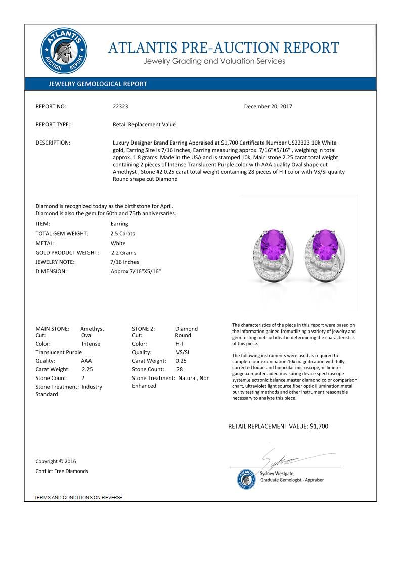 REF-25W6F -22323 ---- 2.50 Amethyst & Micro Pave VS/SI Diamond Stud Earrings 10K White Gold ---- Luxury Designer Brand Earring Appraised at $1,700 Certificate Number US22323 10k White gold, Earring Size is 7/16 Inches, Earring measuring approx. 7/16"X5/16" , weighing in total approx. 1.8 grams. Made in the USA and is stamped 10k, Main stone 2.25 carat total weight containing 2 pieces of Intense Translucent Purple color with AAA quality Oval shape cut Amethyst , Stone #2 0.25 carat total weight containing 28 pieces of H-I color with VS/SI quality Round shape cut Diamond