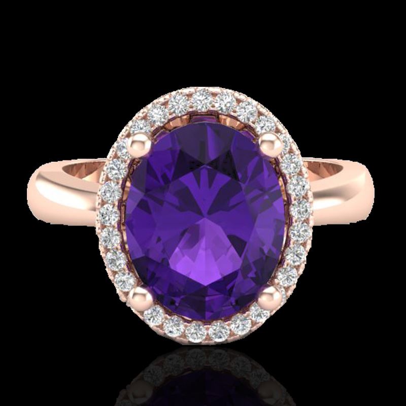 REF-43N6Y -21091 ---- 2.50 CTW Amethyst And Micro Pave VS/SI Diamond Ring Halo 14K Rose Gold ---- Luxury Designer Brand Ring Appraised at $2,900 Certificate Number US21091 14k Rose gold, Ring Size is 6.5, Ring measuring approx. 1/2"X1/2", weighing in total approx. 3.6 grams. Made in the USA and is stamped 14k, Main stone 2.28 carat total weight containing 1 pieces of Intense Translucent Purple color with AAA quality Oval shape cut Amethyst , Stone #2 0.22 carat total weight containing 25 pieces of H-I color with VS/SI quality Round shape cut Diamond