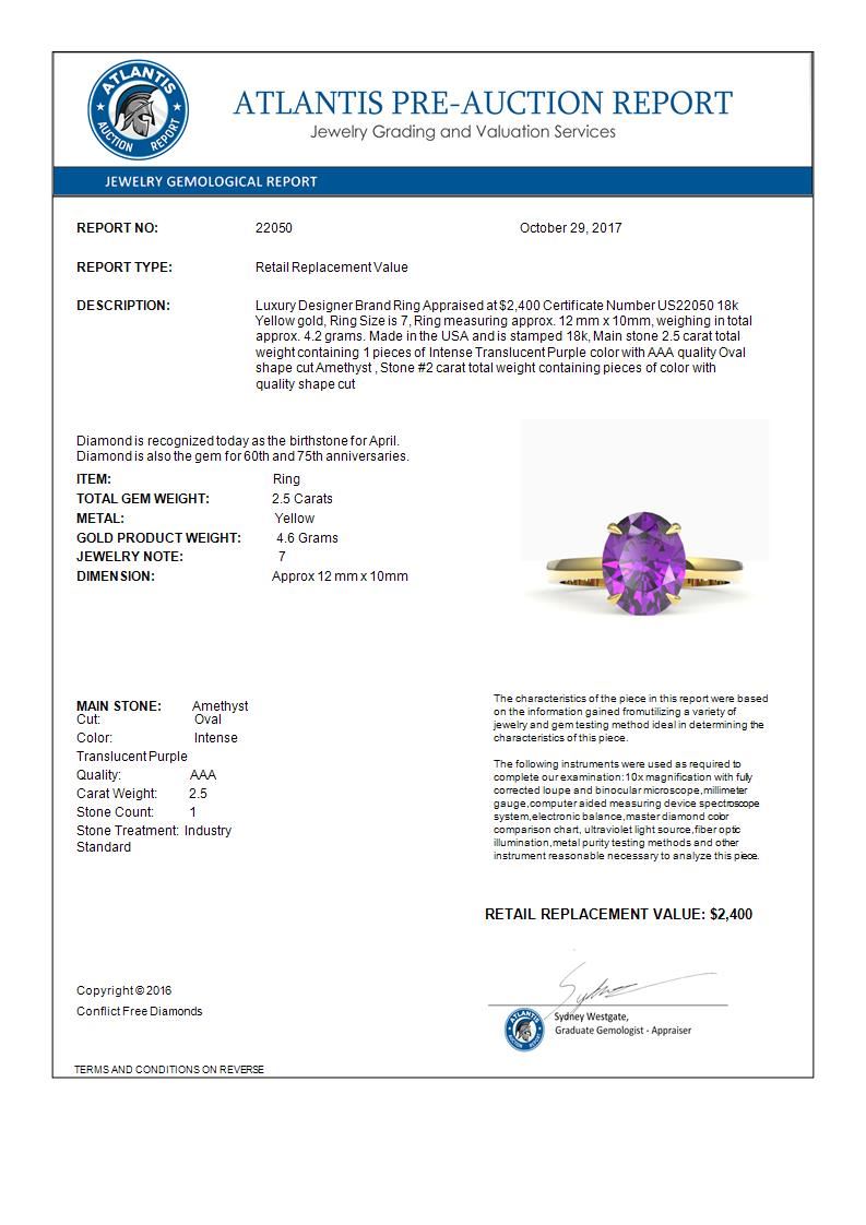 REF-36K2W -22050 ---- 2.50 CTW Amethyst Designer Inspired Solitaire Ring 18K Yellow Gold ---- Luxury Designer Brand Ring Appraised at $2,400 Certificate Number US22050 18k Yellow gold, Ring Size is 7, Ring measuring approx. 12 mm x 10mm, weighing in total approx. 4.2 grams. Made in the USA and is stamped 18k, Main stone 2.5 carat total weight containing 1 pieces of Intense Translucent Purple color with AAA quality Oval shape cut Amethyst , Stone #2 carat total weight containing pieces of color with quality shape cut