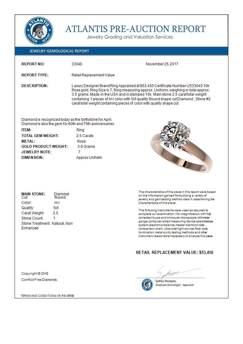 REF-729F2N -33040 ---- 2.50 CTW Certified H-SI/I Quality Diamond Solitaire Engagement Ring 10K Rose Gold ---- Luxury Designer Brand Ring Appraised at $53,450 Certificate Number US33040 10k Rose gold, Ring Size is 7, Ring measuring approx. Uniform, weighing in total approx. 3.5 grams. Made in the USA and is stamped 10k, Main stone 2.5 carat total weight containing 1 pieces of H-I color with SI/I quality Round shape cut Diamond , Stone #2 carat total weight containing pieces of color with quality shape cut