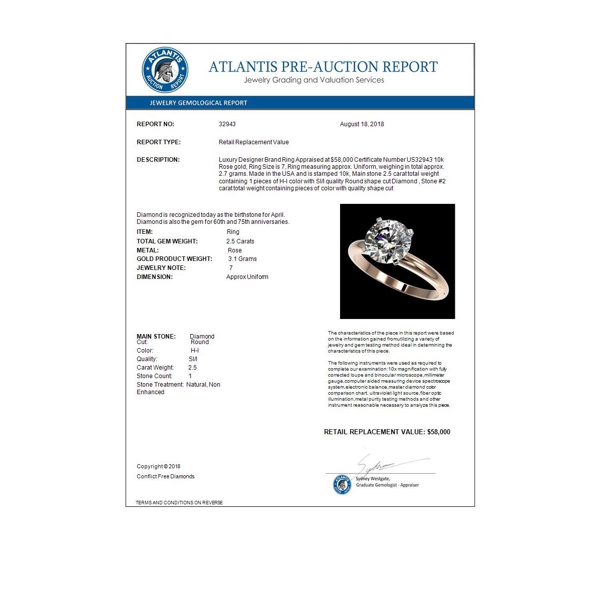 REF-870M2H -32943 ---- 2.50 CTW Certified H-SI/I Quality Diamond Solitaire Engagement Ring 10K Rose Gold ---- Luxury Designer Brand Ring Appraised at $58,000 Certificate Number US32943 10k Rose gold, Ring Size is 7, Ring measuring approx. Uniform, weighing in total approx. 2.7 grams. Made in the USA and is stamped 10k, Main stone 2.5 carat total weight containing 1 pieces of H-I color with SI/I quality Round shape cut Diamond , Stone #2 carat total weight containing pieces of color with quality shape cut
