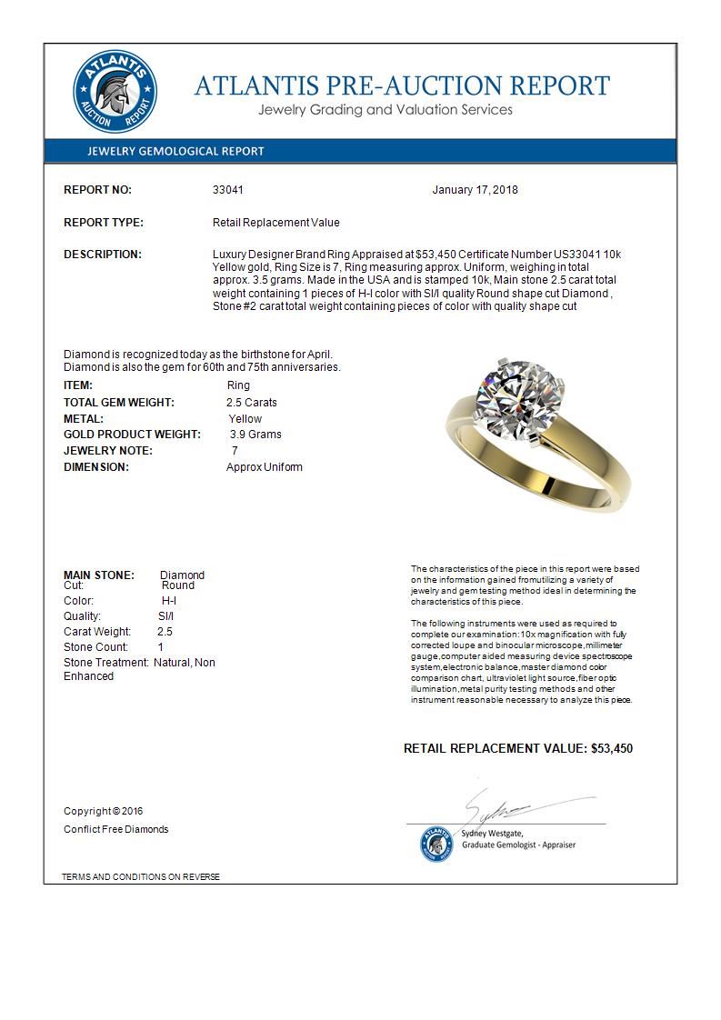 REF-729H2A -33041 ---- 2.50 CTW Certified H-SI/I Quality Diamond Solitaire Engagement Ring 10K Yellow Gold ---- Luxury Designer Brand Ring Appraised at $53,450 Certificate Number US33041 10k Yellow gold, Ring Size is 7, Ring measuring approx. Uniform, weighing in total approx. 3.5 grams. Made in the USA and is stamped 10k, Main stone 2.5 carat total weight containing 1 pieces of H-I color with SI/I quality Round shape cut Diamond , Stone #2 carat total weight containing pieces of color with quality shape cut