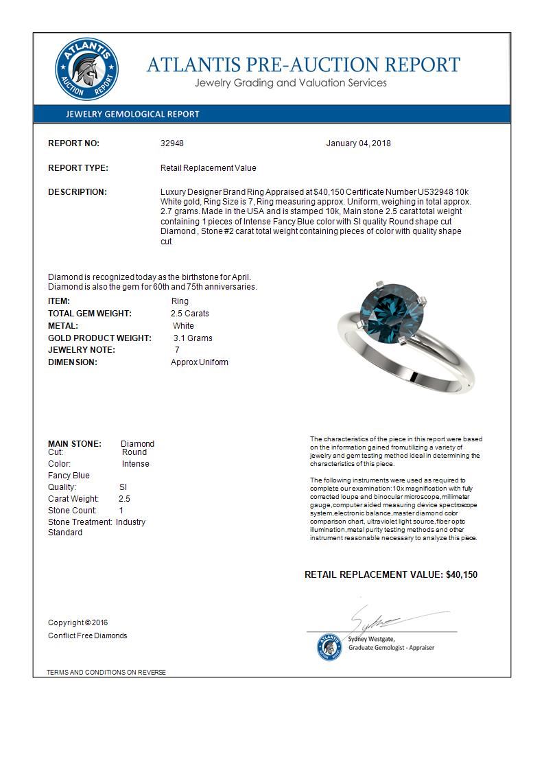 REF-608H5A -32948 ---- 2.50 CTW Certified Intense Blue SI Diamond Solitaire Engagement Ring 10K White Gold ---- Luxury Designer Brand Ring Appraised at $40,150 Certificate Number US32948 10k White gold, Ring Size is 7, Ring measuring approx. Uniform, weighing in total approx. 2.7 grams. Made in the USA and is stamped 10k, Main stone 2.5 carat total weight containing 1 pieces of Intense Fancy Blue color with SI quality Round shape cut Diamond , Stone #2 carat total weight containing pieces of color with quality shape cut
