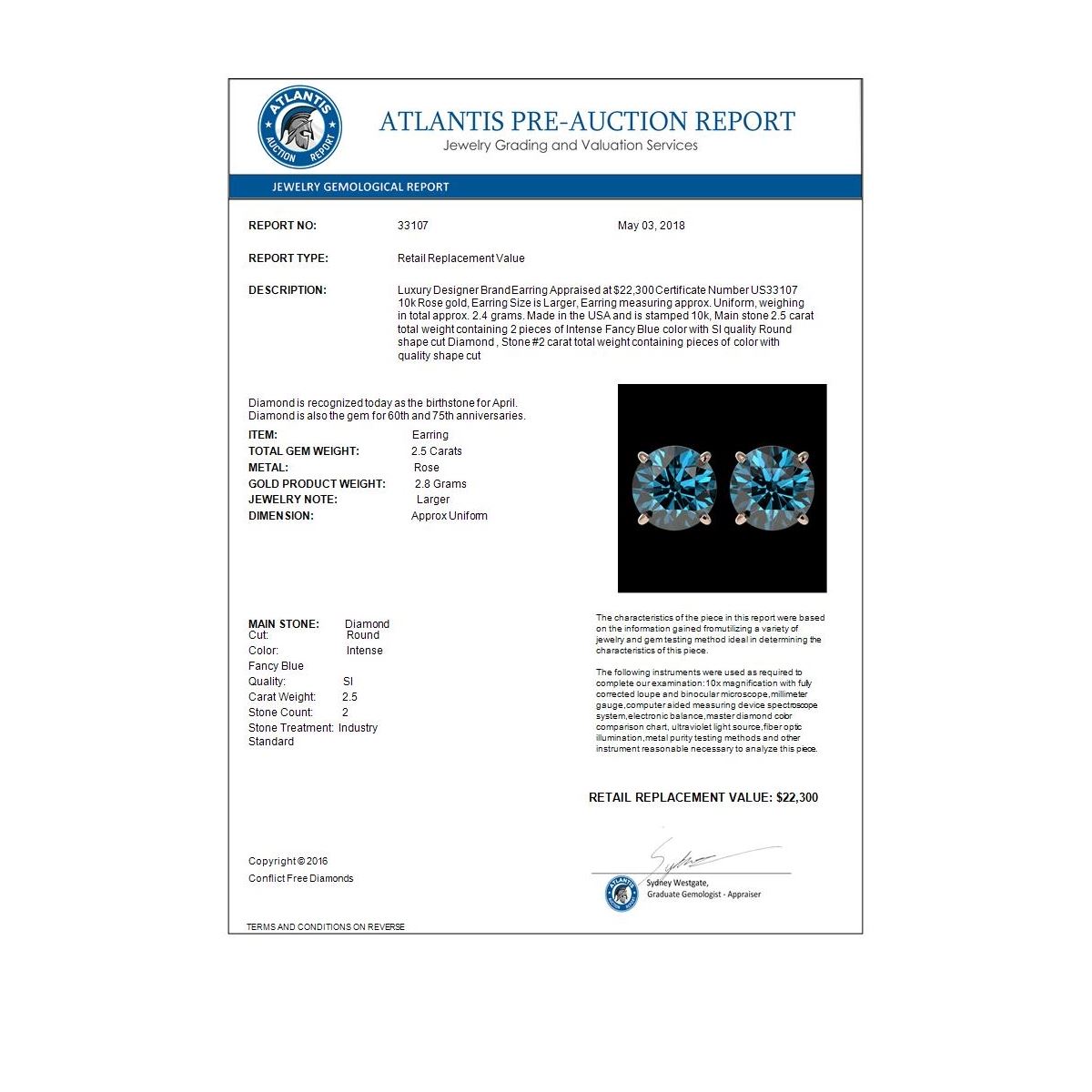 REF-279A2X -33107 ---- 2.50 CTW Certified Intense Blue SI Diamond Solitaire Stud Earrings 10K Rose Gold ---- Luxury Designer Brand Earring Appraised at $22,300 Certificate Number US33107 10k Rose gold, Earring Size is Larger, Earring measuring approx. Uniform, weighing in total approx. 2.4 grams. Made in the USA and is stamped 10k, Main stone 2.5 carat total weight containing 2 pieces of Intense Fancy Blue color with SI quality Round shape cut Diamond , Stone #2 carat total weight containing pieces of color with quality shape cut