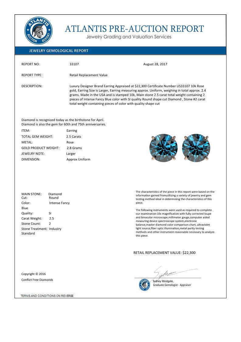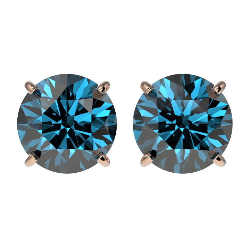 33107 - REF-279M2F ---- 2.50 CTW Certified Intense Blue SI Diamond Solitaire Stud Earrings 10K Rose Gold ---- Luxury Designer Brand Earring Appraised at $22,300 Certificate Number US33107 10k Rose gold, Earring Size is Larger, Earring measuring approx. Uniform, weighing in total approx. 2.4 grams. Made in the USA and is stamped 10k, Main stone 2.5 carat total weight containing 2 pieces of Intense Fancy Blue color with SI quality Round shape cut Diamond , Stone #2 carat total weight containing pieces of color with quality shape cut