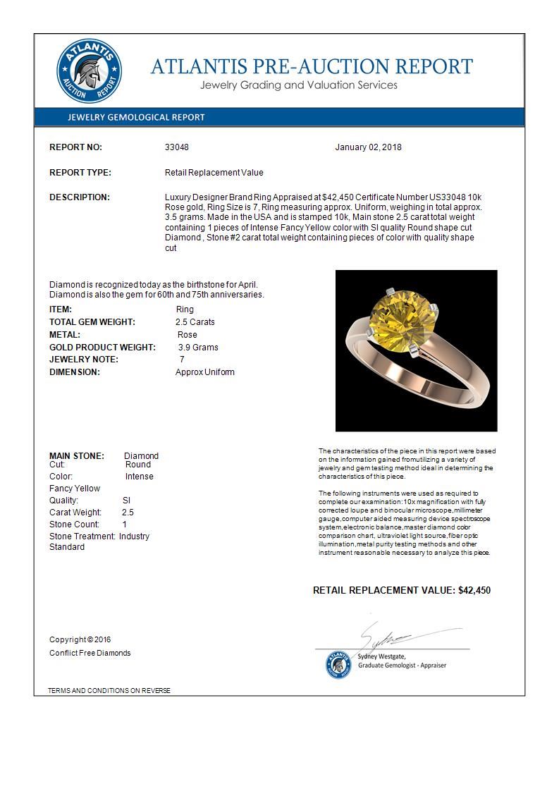 REF-579H2A -33048 ---- 2.50 CTW Certified Intense Yellow SI Diamond Solitaire Ring 10K Rose Gold ---- Luxury Designer Brand Ring Appraised at $42,450 Certificate Number US33048 10k Rose gold, Ring Size is 7, Ring measuring approx. Uniform, weighing in total approx. 3.5 grams. Made in the USA and is stamped 10k, Main stone 2.5 carat total weight containing 1 pieces of Intense Fancy Yellow color with SI quality Round shape cut Diamond , Stone #2 carat total weight containing pieces of color with quality shape cut