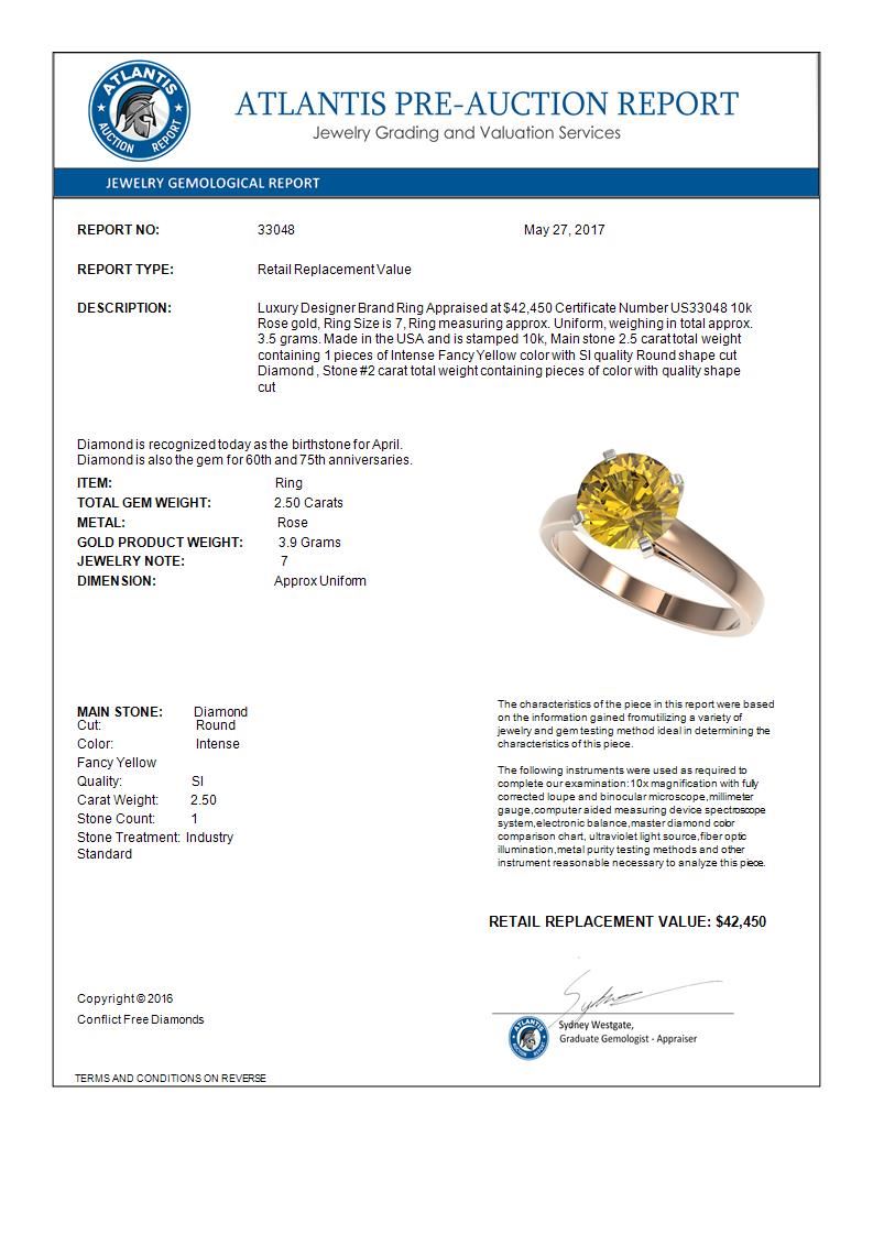 2.50 CTW Certified Intense Yellow SI Diamond Solitaire Ring 10K Rose Gold ---- Luxury Designer Brand Ring Appraised Retail Price at $42,450 ---- SKU Number US33048 10k Rose gold Ring Size is 7, Ring measuring approx. Uniform, weighing in total approx. 3.5 grams. Made in the USA and is stamped 10k, Main stone 2.50 carat total weight containing 1 pieces of Intense Fancy Yellow color with SI quality Round shape cut Diamond , Stone #2 carat total weight containing pieces of color with quality shape cut