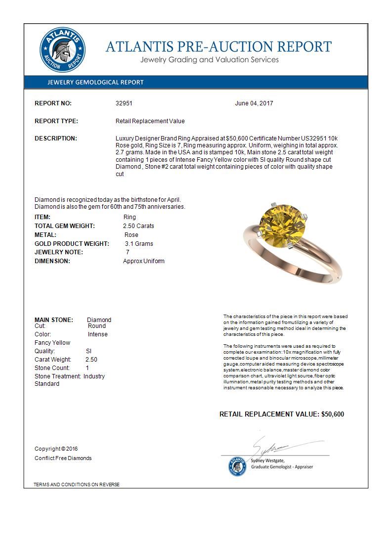 2.50 CTW Certified Intense Yellow SI Diamond Solitaire Ring 10K Rose Gold ---- Luxury Designer Brand Ring Appraised Retail Price at $50,600 ---- SKU Number US32951 10k Rose gold Ring Size is 7, Ring measuring approx. Uniform, weighing in total approx. 2.7 grams. Made in the USA and is stamped 10k, Main stone 2.50 carat total weight containing 1 pieces of Intense Fancy Yellow color with SI quality Round shape cut Diamond , Stone #2 carat total weight containing pieces of color with quality shape cut