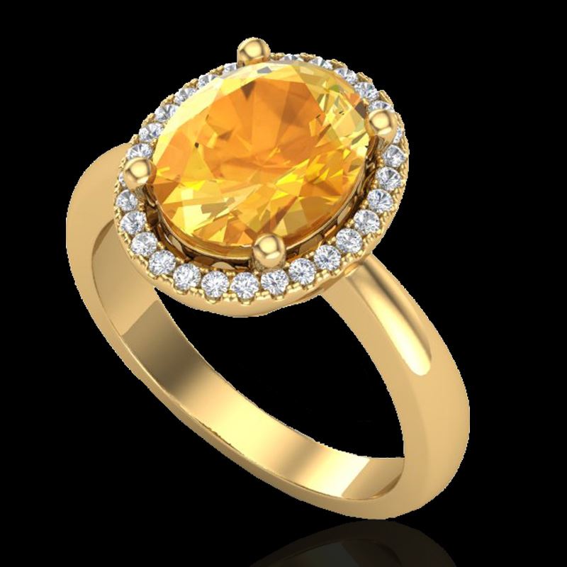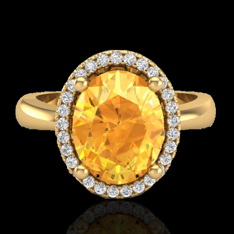REF-50W2F -21102 ---- 2.50 CTW Citrine And Micro Pave VS/SI Diamond Ring Halo 18K Yellow Gold ---- Luxury Designer Brand Ring Appraised at $3,300 Certificate Number US21102 18k Yellow gold, Ring Size is 6.5, Ring measuring approx. 1/2"X1/2", weighing in total approx. 4.4 grams. Made in the USA and is stamped 18k, Main stone 2.28 carat total weight containing 1 pieces of Translucent Yellow color with AAA quality Oval shape cut Citrine , Stone #2 0.22 carat total weight containing 25 pieces of H-I color with VS/SI quality Round shape cut Diamond