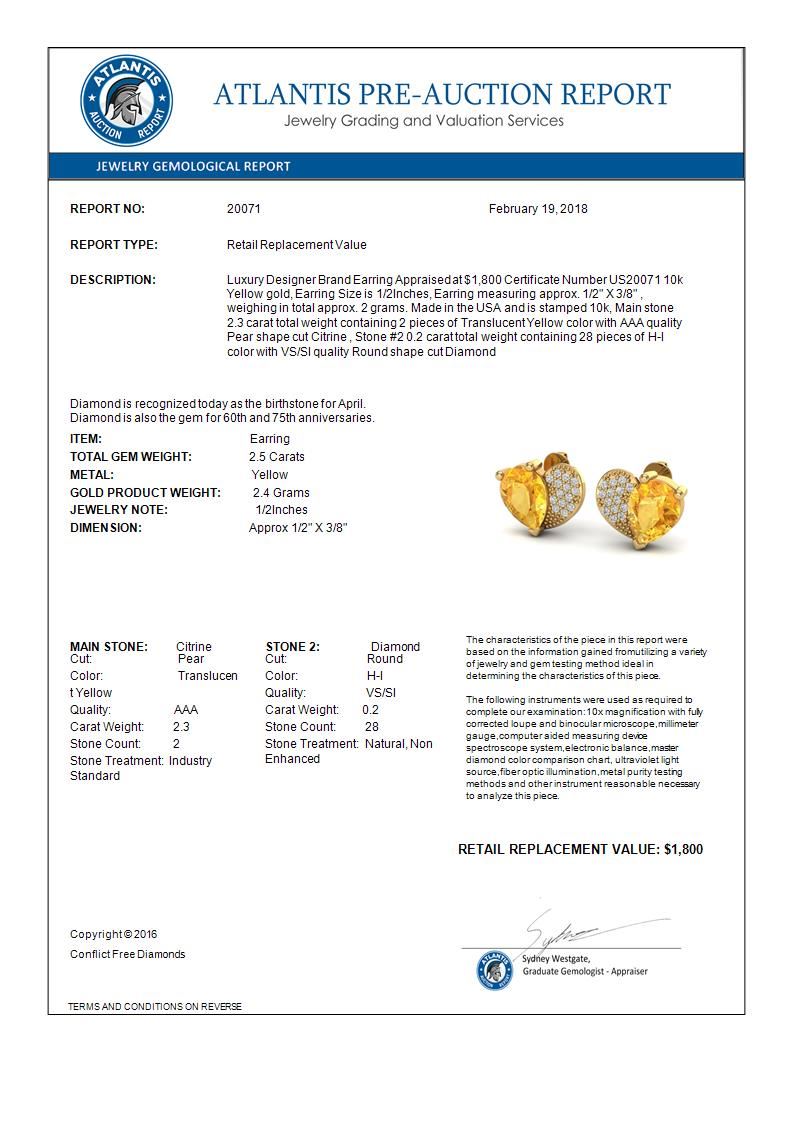 REF-30W2F -20071 ---- 2.50 CTW Citrine & Micro Pave VS/SI Diamond Earrings 10K Yellow Gold ---- Luxury Designer Brand Earring Appraised at $1,800 Certificate Number US20071 10k Yellow gold, Earring Size is 1/2Inches, Earring measuring approx. 1/2" X 3/8" , weighing in total approx. 2 grams. Made in the USA and is stamped 10k, Main stone 2.3 carat total weight containing 2 pieces of Translucent Yellow color with AAA quality Pear shape cut Citrine , Stone #2 0.2 carat total weight containing 28 pieces of H-I color with VS/SI quality Round shape cut Diamond