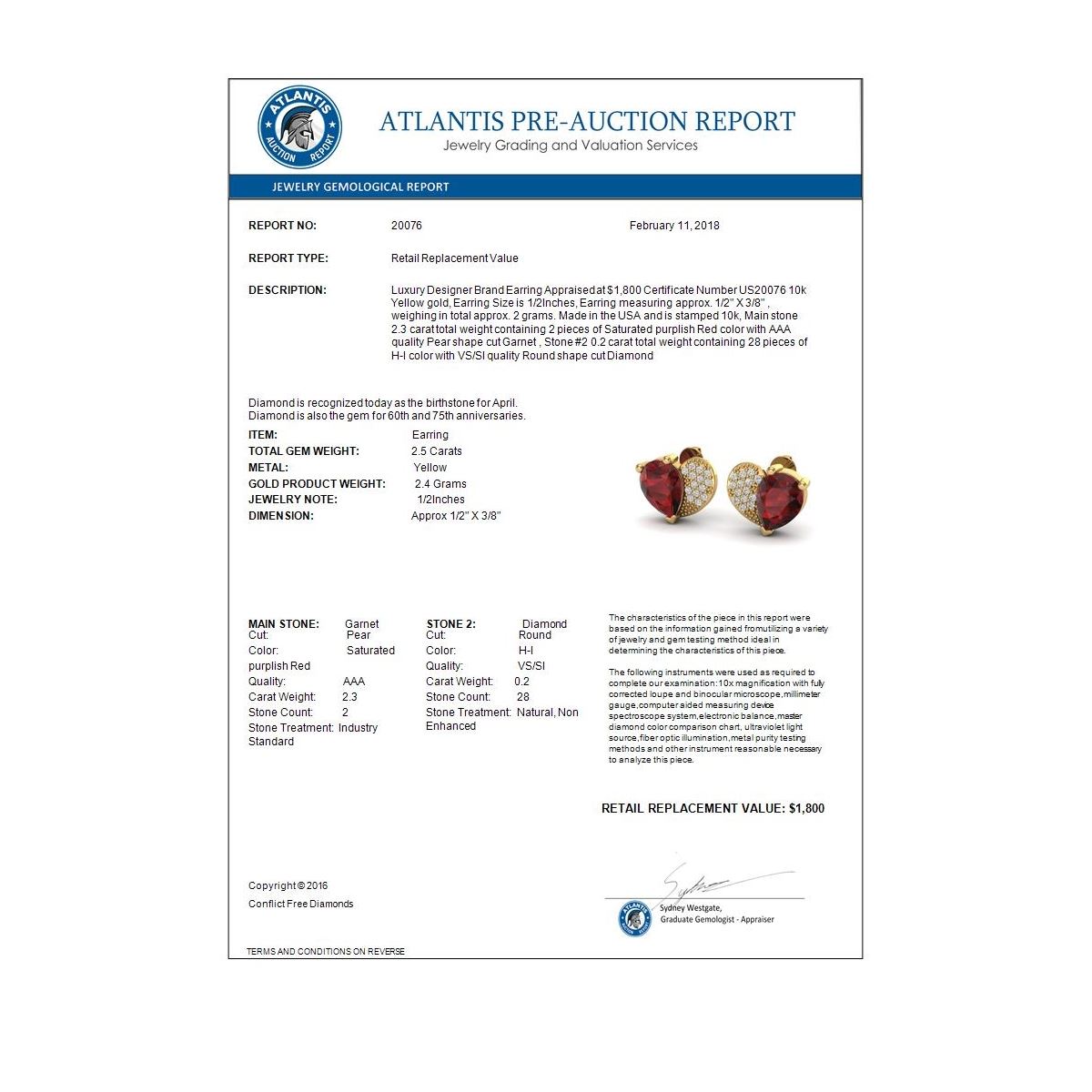 REF-30A2X -20076 ---- 2.50 CTW Garnet & Micro Pave VS/SI Diamond Earrings 10K Yellow Gold ---- Luxury Designer Brand Earring Appraised at $1,800 Certificate Number US20076 10k Yellow gold, Earring Size is 1/2Inches, Earring measuring approx. 1/2" X 3/8" , weighing in total approx. 2 grams. Made in the USA and is stamped 10k, Main stone 2.3 carat total weight containing 2 pieces of Saturated purplish Red color with AAA quality Pear shape cut Garnet , Stone #2 0.2 carat total weight containing 28 pieces of H-I color with VS/SI quality Round shape cut Diamond