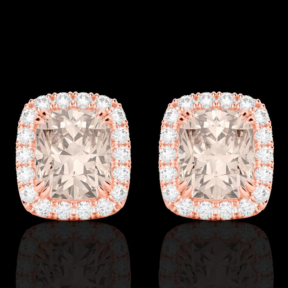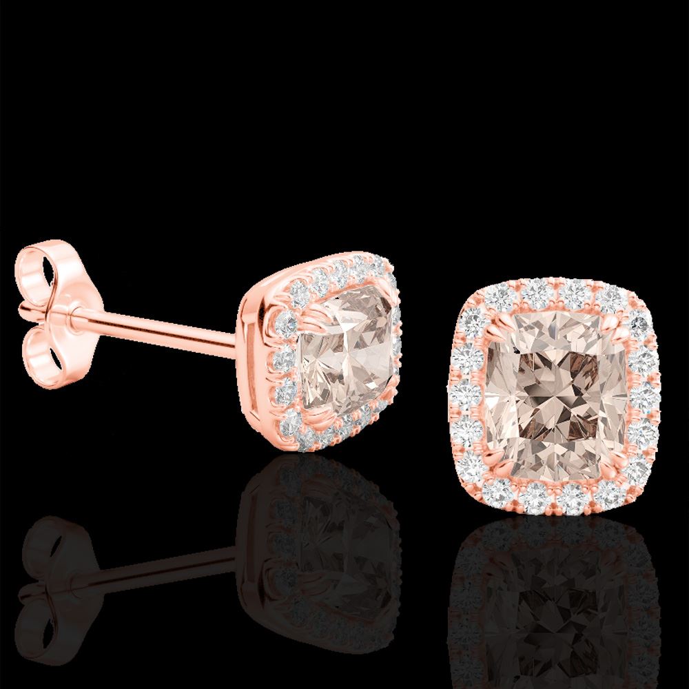 REF-57W3F -22867 ---- 2.50 CTW Morganite & Micro Pave VS/SI Diamond Halo Earrings 10K Rose Gold ---- Luxury Designer Brand Earring Appraised at $3,800 Certificate Number US22867 10k Rose gold, Earring Size is 3/8 Inches, Earring measuring approx. 3/8" X 7/16" , weighing in total approx. 3.2 grams. Made in the USA and is stamped 10k, Main stone 2.15 carat total weight containing 2 pieces of Medium Orange Pink color with AAA quality Cushion shape cut Morganite , Stone #2 0.35 carat total weight containing 36 pieces of H-I color with VS/SI quality Round shape cut Diamond