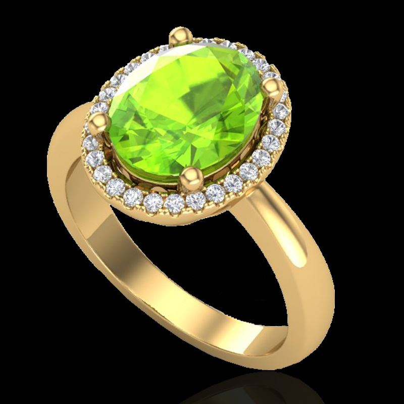 REF-54Y8K -21111 ---- 2.50 CTW Peridot & Micro Pave VS/SI Diamond Ring Halo 18K Yellow Gold ---- Luxury Designer Brand Ring Appraised at $3,900 Certificate Number US21111 18k Yellow gold, Ring Size is 6.5, Ring measuring approx. 1/2"X1/2", weighing in total approx. 4.4 grams. Made in the USA and is stamped 18k, Main stone 2.28 carat total weight containing 1 pieces of Intense Green color with AAA quality Oval shape cut Peridot , Stone #2 0.22 carat total weight containing 25 pieces of H-I color with VS/SI quality Round shape cut Diamond