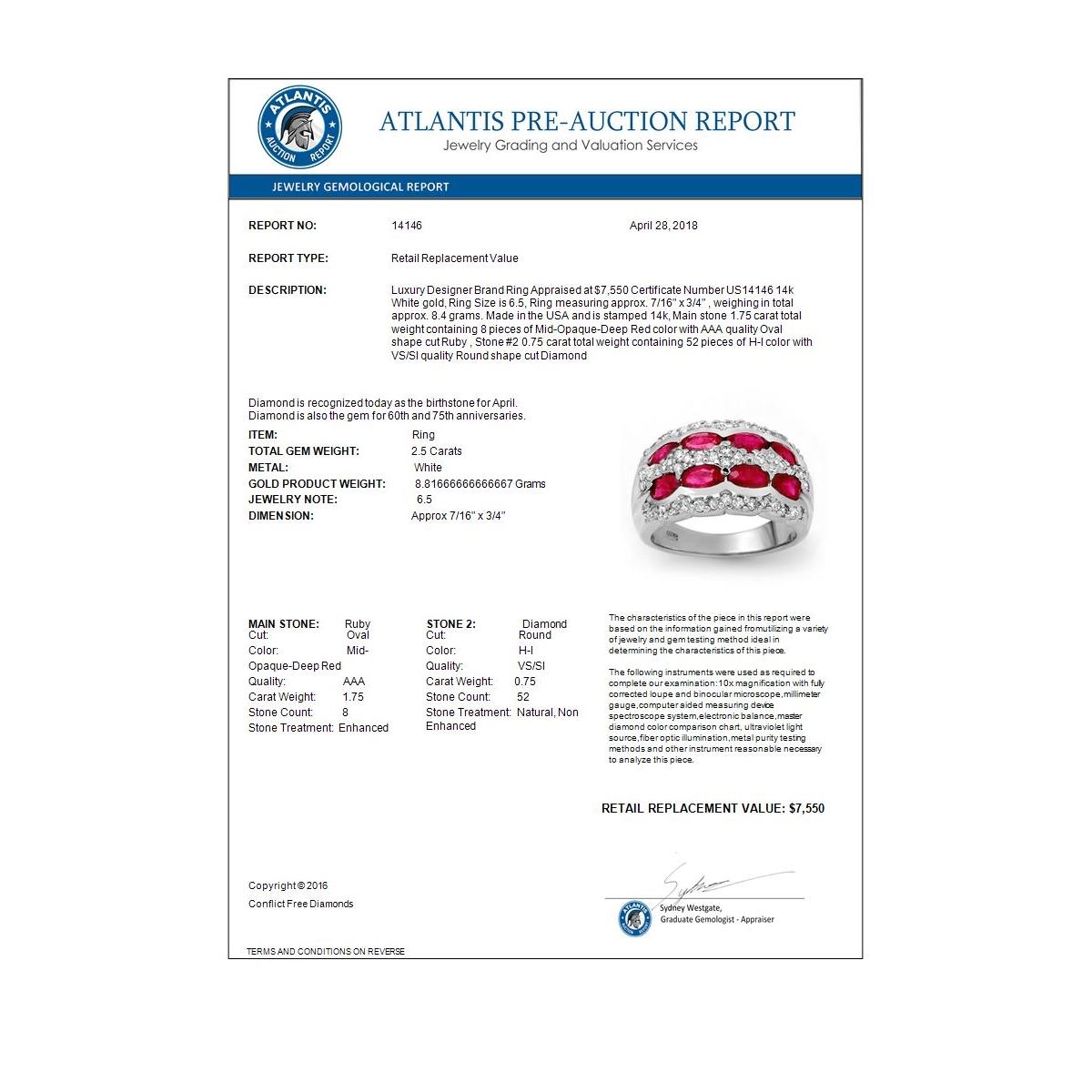 REF-105M5H -14146 ---- 2.50 CTW Ruby & Diamond Ring 14K White Gold ---- Luxury Designer Brand Ring Appraised at $7,550 Certificate Number US14146 14k White gold, Ring Size is 6.5, Ring measuring approx. 7/16" x 3/4" , weighing in total approx. 8.4 grams. Made in the USA and is stamped 14k, Main stone 1.75 carat total weight containing 8 pieces of Mid-Opaque-Deep Red color with AAA quality Oval shape cut Ruby , Stone #2 0.75 carat total weight containing 52 pieces of H-I color with VS/SI quality Round shape cut Diamond