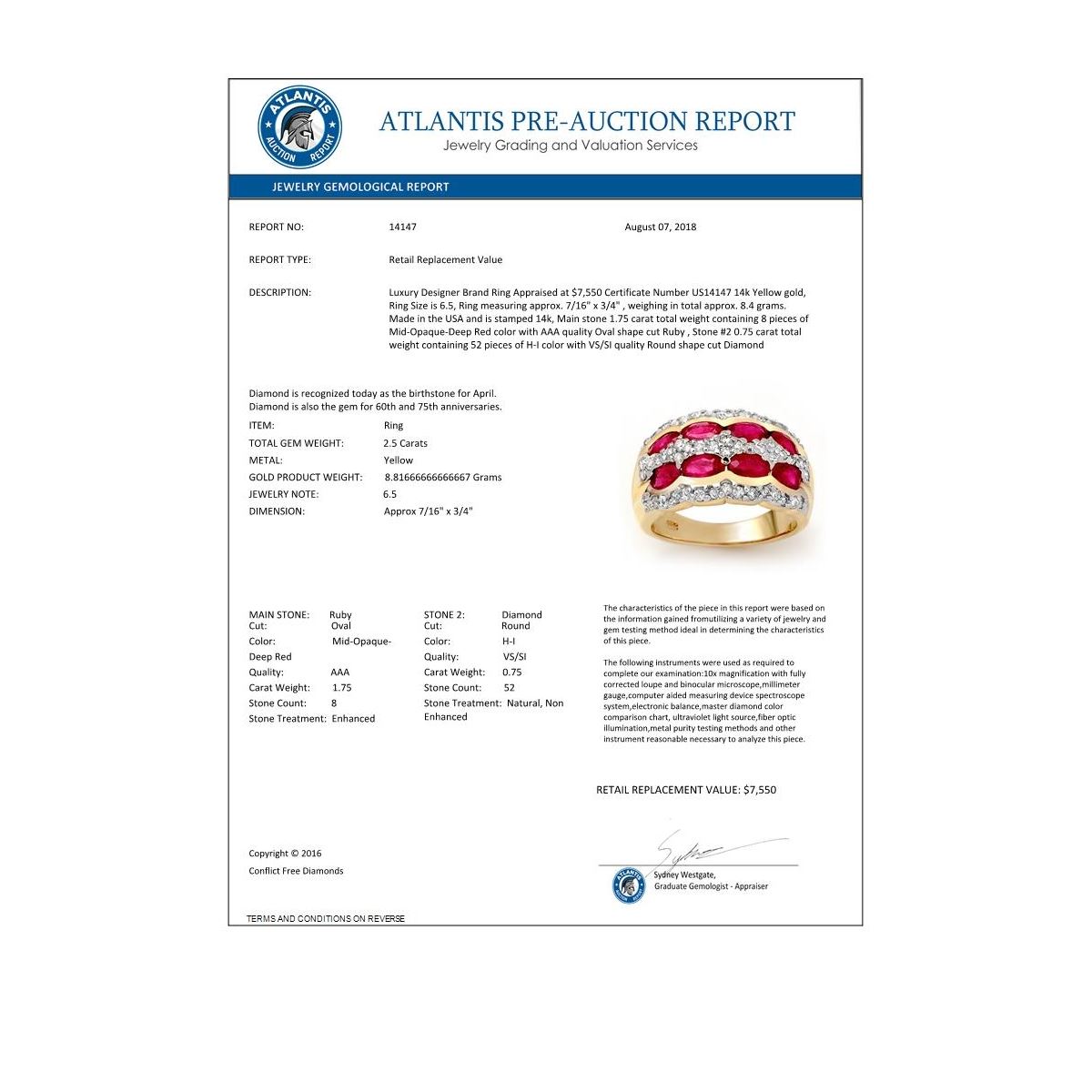 REF-105H5A -14147 ---- 2.50 CTW Ruby & Diamond Ring 14K Yellow Gold ---- Luxury Designer Brand Ring Appraised at $7,550 Certificate Number US14147 14k Yellow gold, Ring Size is 6.5, Ring measuring approx. 7/16" x 3/4" , weighing in total approx. 8.4 grams. Made in the USA and is stamped 14k, Main stone 1.75 carat total weight containing 8 pieces of Mid-Opaque-Deep Red color with AAA quality Oval shape cut Ruby , Stone #2 0.75 carat total weight containing 52 pieces of H-I color with VS/SI quality Round shape cut Diamond