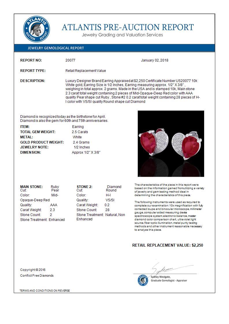 REF-33M8H -20077 ---- 2.50 CTW Ruby & Micro Pave VS/SI Diamond Earrings 10K White Gold ---- Luxury Designer Brand Earring Appraised at $2,250 Certificate Number US20077 10k White gold, Earring Size is 1/2 Inches, Earring measuring approx. 1/2" X 3/8" , weighing in total approx. 2 grams. Made in the USA and is stamped 10k, Main stone 2.3 carat total weight containing 2 pieces of Mid-Opaque-Deep Red color with AAA quality Pear shape cut Ruby , Stone #2 0.2 carat total weight containing 28 pieces of H-I color with VS/SI quality Round shape cut Diamond