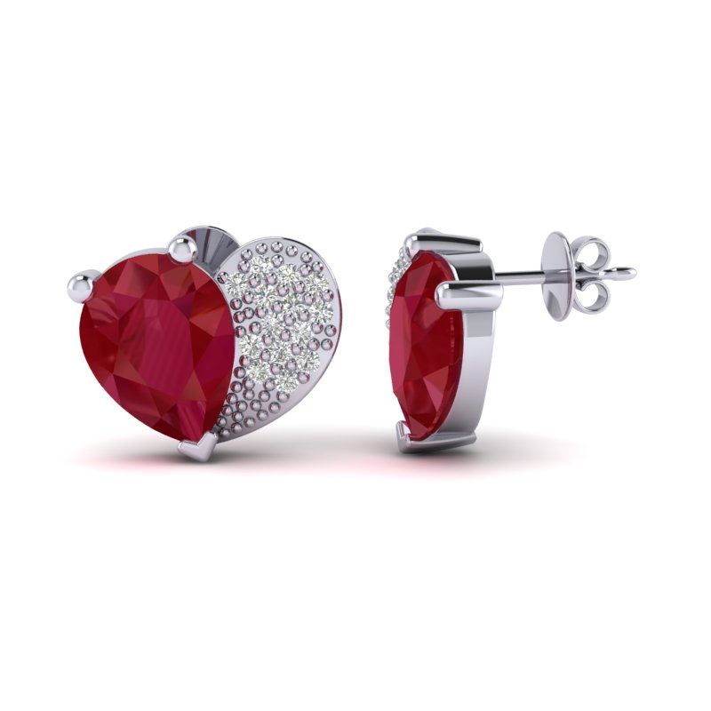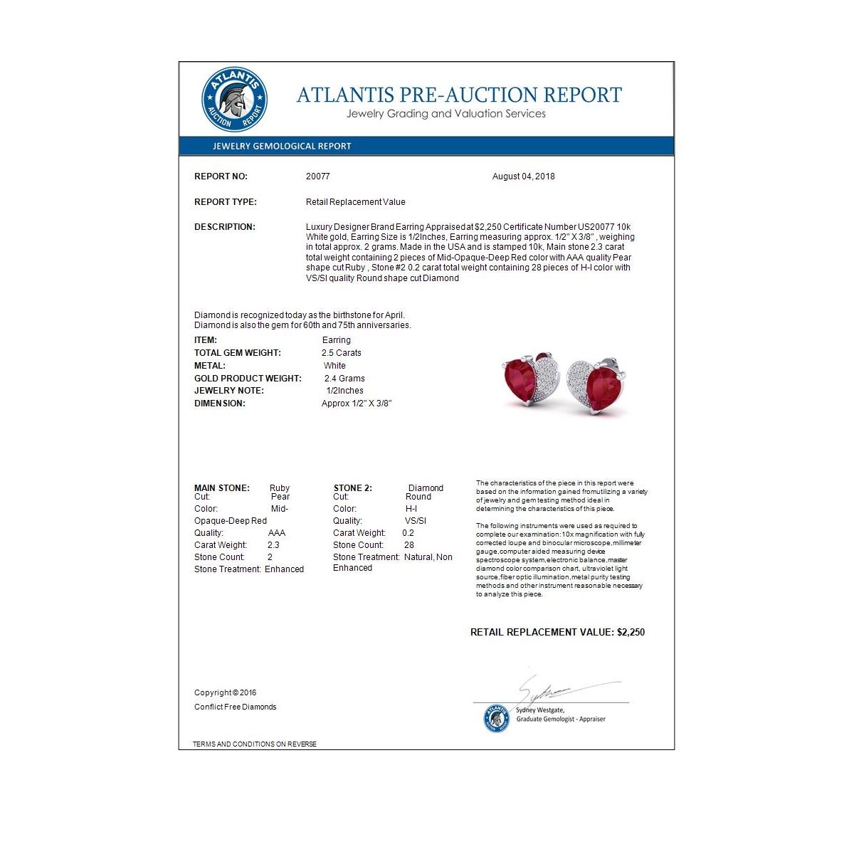 REF-33T8M -20077 ---- 2.50 CTW Ruby & Micro Pave VS/SI Diamond Earrings 10K White Gold ---- Luxury Designer Brand Earring Appraised at $2,250 Certificate Number US20077 10k White gold, Earring Size is 1/2Inches, Earring measuring approx. 1/2" X 3/8" , weighing in total approx. 2 grams. Made in the USA and is stamped 10k, Main stone 2.3 carat total weight containing 2 pieces of Mid-Opaque-Deep Red color with AAA quality Pear shape cut Ruby , Stone #2 0.2 carat total weight containing 28 pieces of H-I color with VS/SI quality Round shape cut Diamond