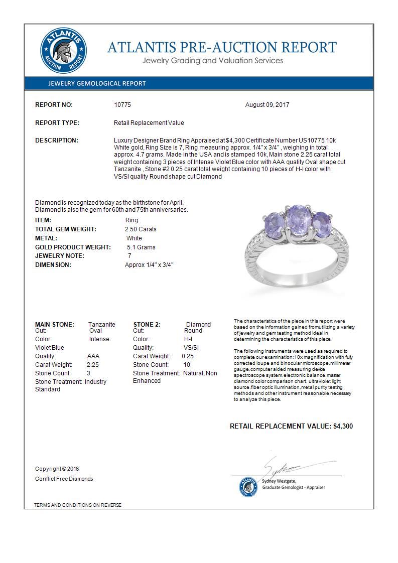 2.50 CTW Tanzanite & Diamond Ring 10K White Gold ---- Luxury Designer Brand Ring Appraised Retail Price at $4,300 ---- SKU Number US10775 10k White gold Ring Size is 7, Ring measuring approx. 1/4" x 3/4" , weighing in total approx. 4.7 grams. Made in the USA and is stamped 10k, Main stone 2.25 carat total weight containing 3 pieces of Intense Violet Blue color with AAA quality Oval shape cut Tanzanite , Stone #2 0.25 carat total weight containing 10 pieces of H-I color with VS/SI quality Round shape cut