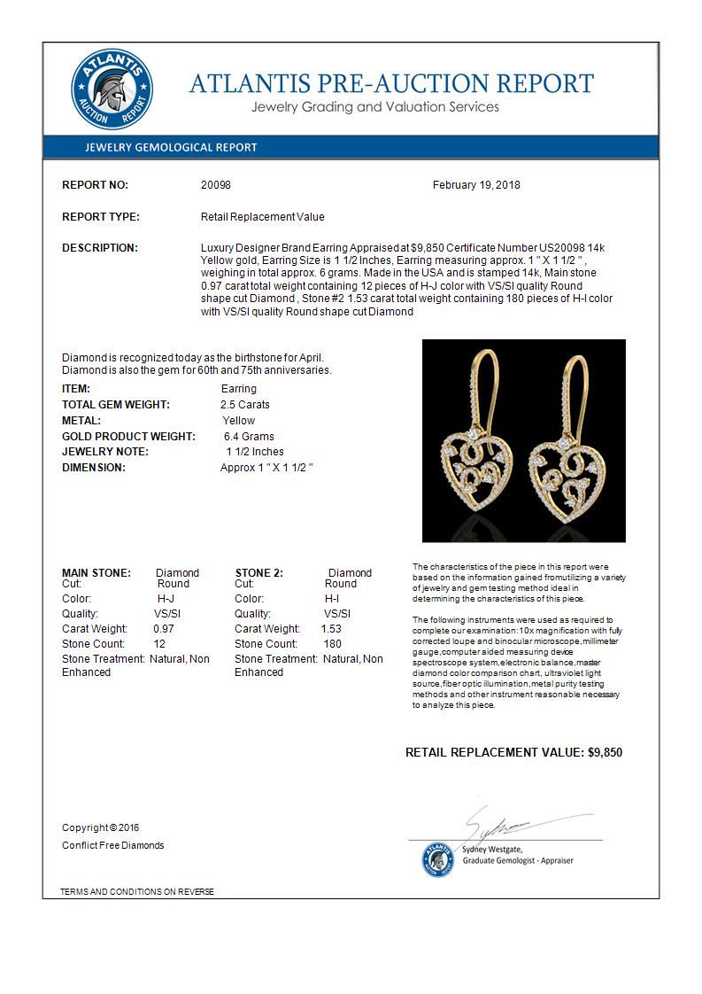 REF-179T3M -20098 ---- 2.50 CTW VS/SI Diamond Micro Pave Designer Earrings 14K Yellow Gold ---- Luxury Designer Brand Earring Appraised at $9,850 Certificate Number US20098  14k Yellow gold,  Earring Size is 1 1/2 Inches, Earring measuring approx. 1 " X 1 1/2 "  , weighing in total approx. 6 grams. Made in the USA and is stamped 14k, Main stone 0.97 carat total weight containing 12 pieces of H-J color with VS/SI quality Round shape cut Diamond , Stone #2 1.53 carat total weight containing 180 pieces of H-I color with  VS/SI quality Round shape cut Diamond