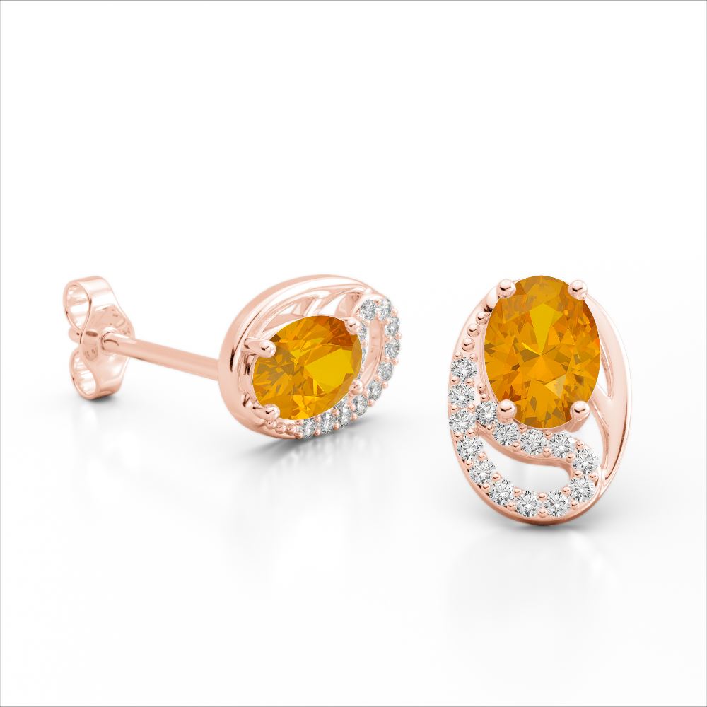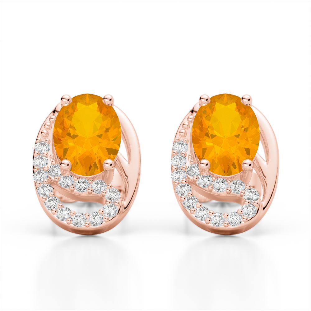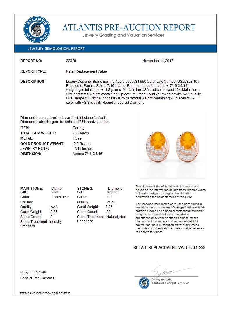 REF-25M6H -22328 ---- 2.50 Citrine & Micro Pave VS/SI Diamond Stud Earrings 10K Rose Gold ---- Luxury Designer Brand Earring Appraised at $1,550 Certificate Number US22328 10k Rose gold, Earring Size is 7/16 Inches, Earring measuring approx. 7/16"X5/16" , weighing in total approx. 1.8 grams. Made in the USA and is stamped 10k, Main stone 2.25 carat total weight containing 2 pieces of Translucent Yellow color with AAA quality Oval shape cut Citrine , Stone #2 0.25 carat total weight containing 28 pieces of H-I color with VS/SI quality Round shape cut Diamond