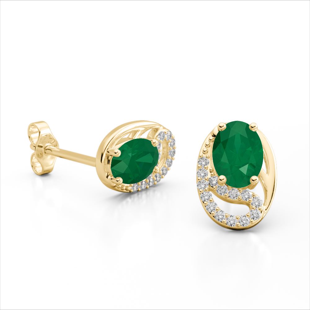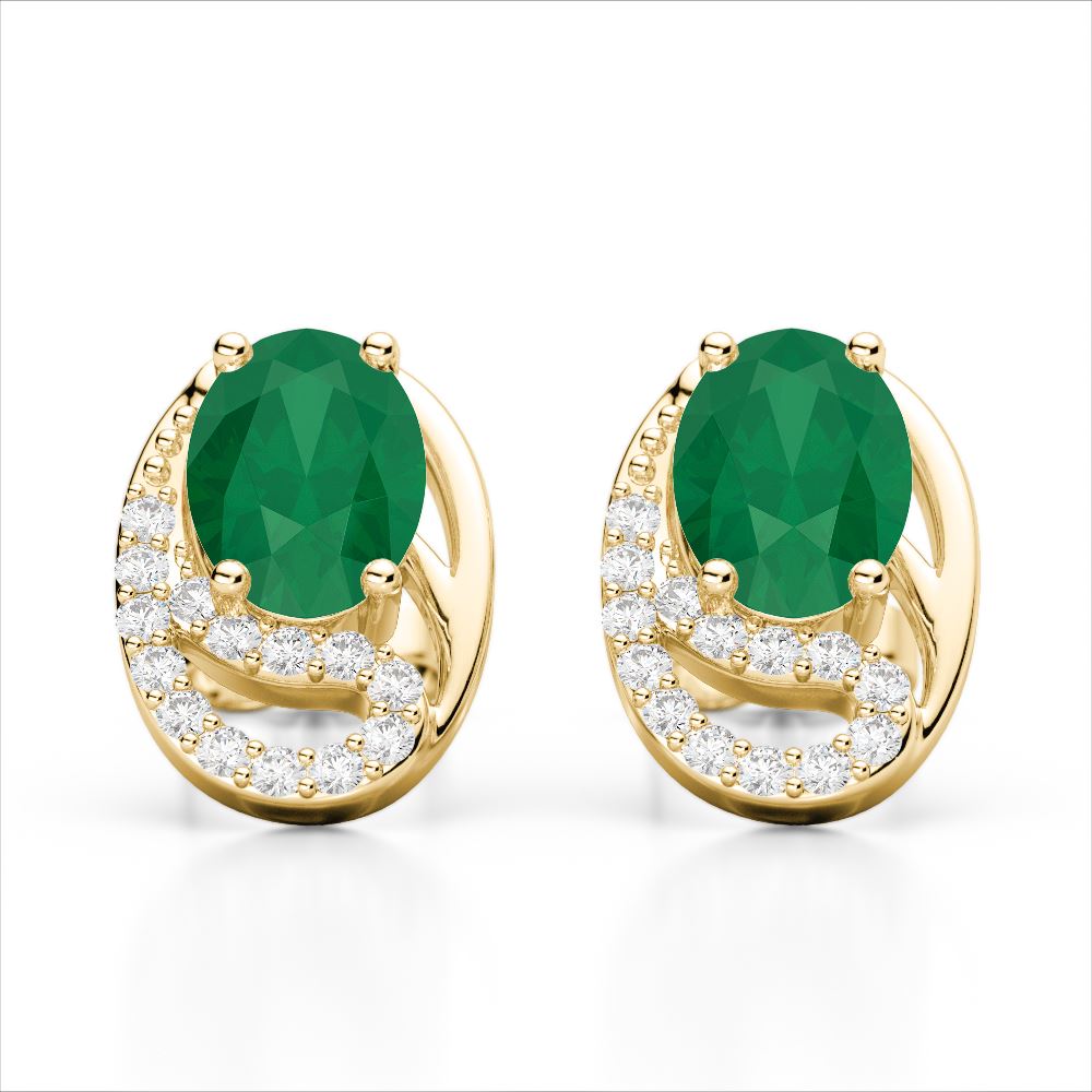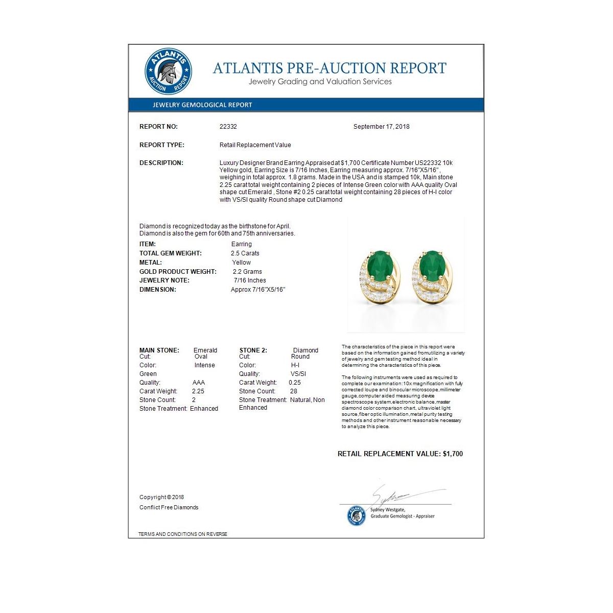 REF-25H6A -22332 ---- 2.50 Emerald & Micro Pave VS/SI Diamond Stud Earrings 10K Yellow Gold ---- Luxury Designer Brand Earring Appraised at $1,700 Certificate Number US22332 10k Yellow gold, Earring Size is 7/16 Inches, Earring measuring approx. 7/16"X5/16" , weighing in total approx. 1.8 grams. Made in the USA and is stamped 10k, Main stone 2.25 carat total weight containing 2 pieces of Intense Green color with AAA quality Oval shape cut Emerald , Stone #2 0.25 carat total weight containing 28 pieces of H-I color with VS/SI quality Round shape cut Diamond