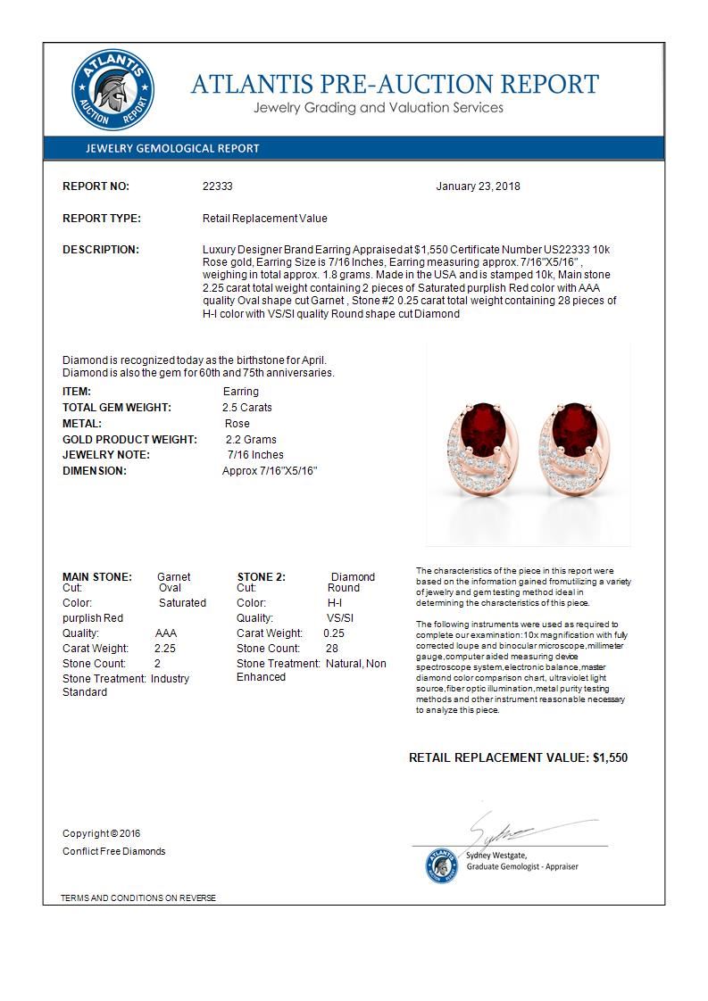 REF-25W6F -22333 ---- 2.50 Garnet & Micro Pave VS/SI Diamond Stud Earrings 10K Rose Gold ---- Luxury Designer Brand Earring Appraised at $1,550 Certificate Number US22333 10k Rose gold, Earring Size is 7/16 Inches, Earring measuring approx. 7/16"X5/16" , weighing in total approx. 1.8 grams. Made in the USA and is stamped 10k, Main stone 2.25 carat total weight containing 2 pieces of Saturated purplish Red color with AAA quality Oval shape cut Garnet , Stone #2 0.25 carat total weight containing 28 pieces of H-I color with VS/SI quality Round shape cut Diamond