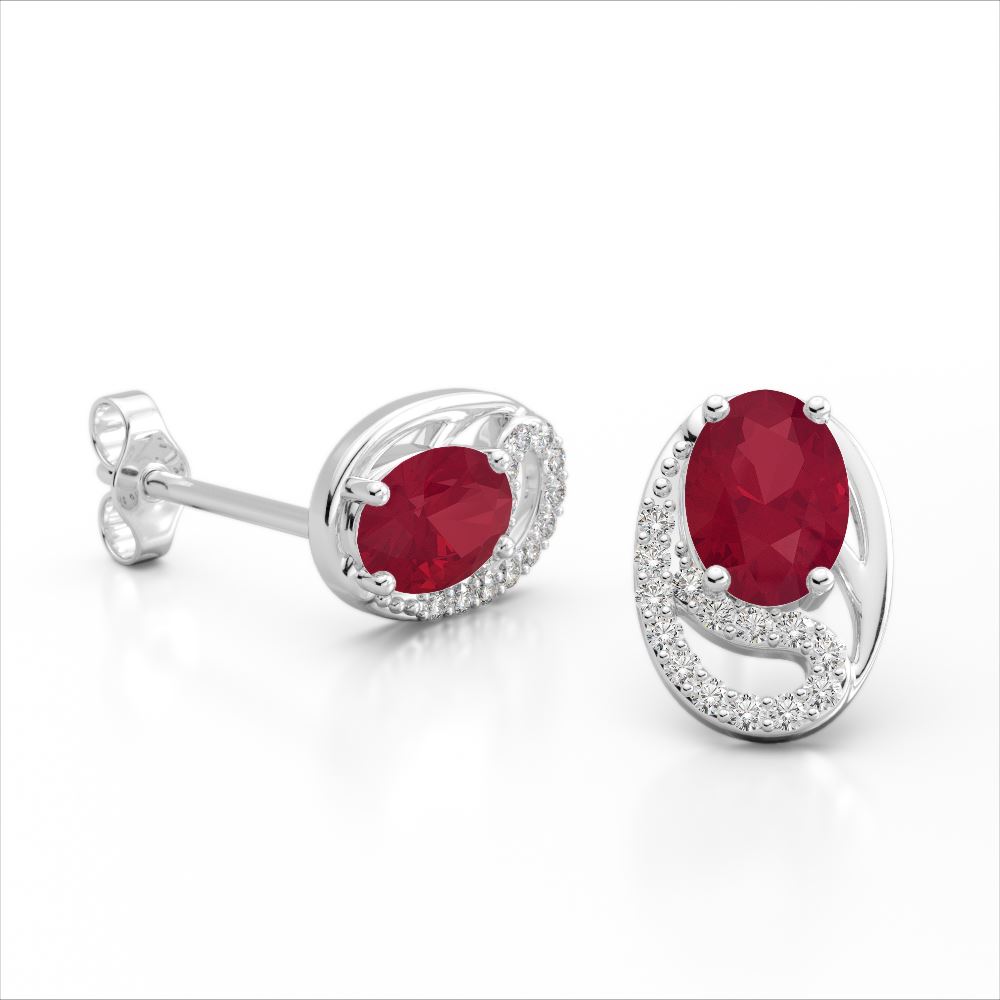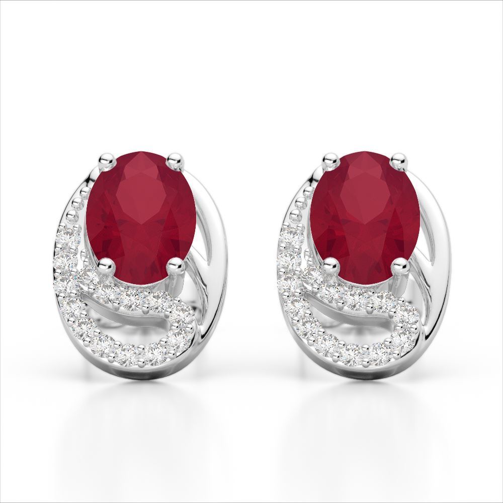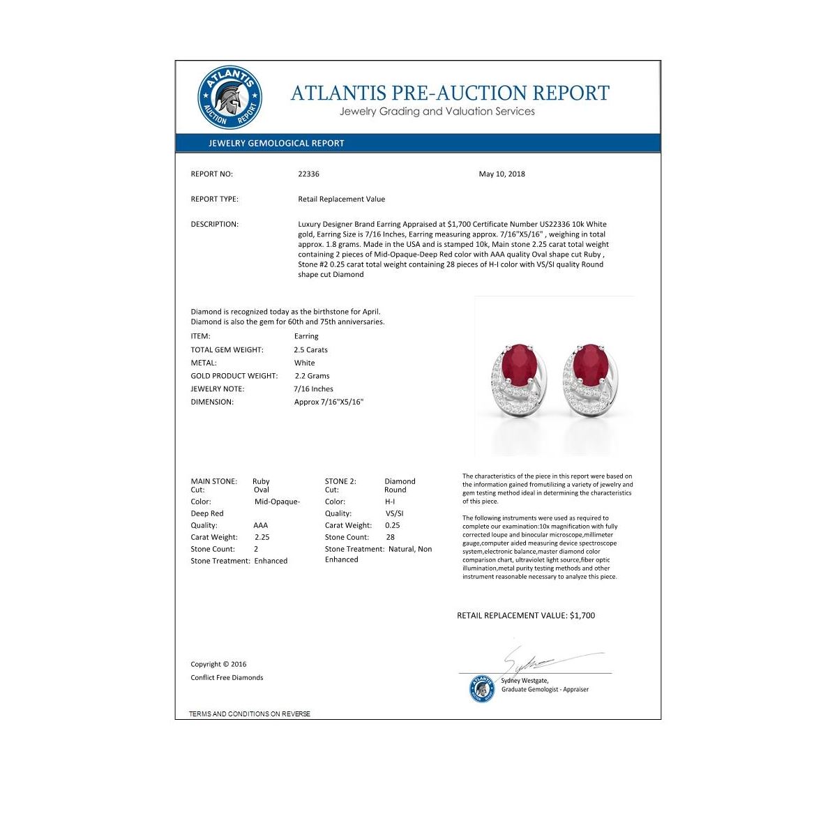 REF-25A6X -22336 ---- 2.50 Ruby & Micro Pave VS/SI Diamond Stud Earrings 10K White Gold ---- Luxury Designer Brand Earring Appraised at $1,700 Certificate Number US22336 10k White gold, Earring Size is 7/16 Inches, Earring measuring approx. 7/16"X5/16" , weighing in total approx. 1.8 grams. Made in the USA and is stamped 10k, Main stone 2.25 carat total weight containing 2 pieces of Mid-Opaque-Deep Red color with AAA quality Oval shape cut Ruby , Stone #2 0.25 carat total weight containing 28 pieces of H-I color with VS/SI quality Round shape cut Diamond