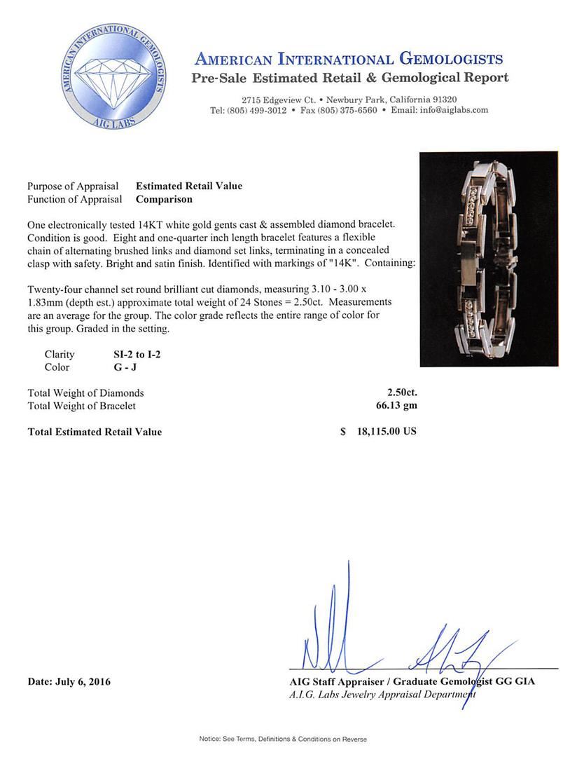 One electronically tested 14KT white gold gents cast & assembled diamond bracelet. Eight and one-quarter inch length bracelet features a flexible chain of alternating brushed links and diamond set links, terminating in a concealed clasp with safety. Bright and satin finish. Identified with markings of "14K". Condition is good. Containing: Twenty-Four channel set round brilliant cut diamonds, measuring 3.10 - 3.00 x 1.83mm (depth est.) approximate total weight of 24 Stones = 2.50ct. Measurements are an average for the group. The color grade reflects the entire range of color for this group. Graded in the setting. Clarity: SI-2 to I-2. Color: G - J. Total Weight of Diamonds 2.50ct. Total Weight of Bracelet 66.13gm. AIG Appraised at $18,155.00.