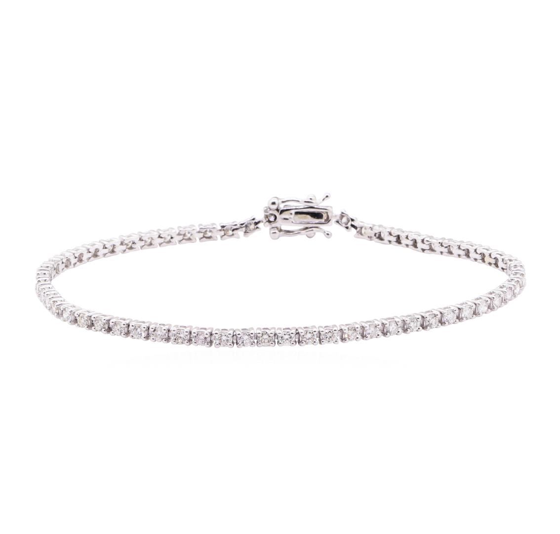 One electronically tested 14KT white gold lady's combination cast & assembled fashion tennis bracelet with a tongue clasp with double foldover safeties with a bright polish finish. The featured lady's bracelet measures approximately seven and three quarter inches in length. Identified with markings of '14K'. Condition is new, good workmanship. Containing: Fifty-Nine prong set round brilliant cut diamonds, measuring 2.20 - 2.15 x 1.35mm (depth est.) approximate total weight of 59 Stones = 2.50ct. Graded in the setting. Color I - J Clarity VS-2 to SI-2 Cut Good. Total Weight of Diamonds 2.50ct.. Total Weight of Bracelet 7.30gm GAS Appraised at $6755.00. GAS Appraised at $6,755.00.