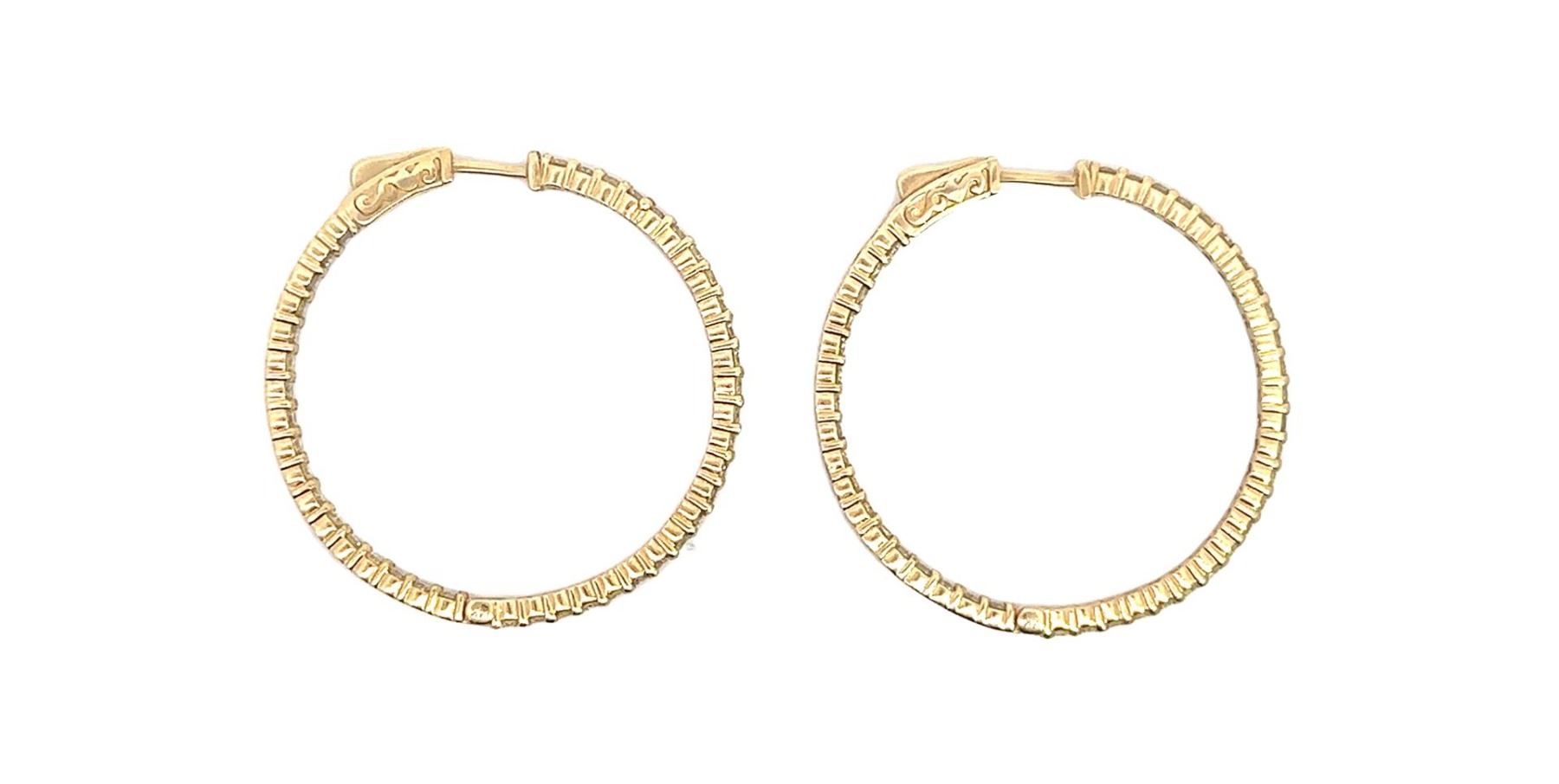 One pair electronically tested 14KT yellow gold lady's combination cast & assembled fashion inside-out hoop earrings with a bright polish finish. The featured hoop earring has a diameter of 37 millimeter. Identified with markings of "14K". Condition is new, good workmanship. Containing: Eighty-Four prong set round brilliant cut diamonds, measuring 1.95 - 1.95 x 1.24mm (depth est.) approximate total weight of 84 Stones = 2.50ct. Graded in the setting. Color I - J Clarity VS-2 to SI-1 Cut Very Good Total Weight of Diamonds 2.50ct. Total Weight of Earrings 8.30gm Estimated Retail Value $ 8500.00