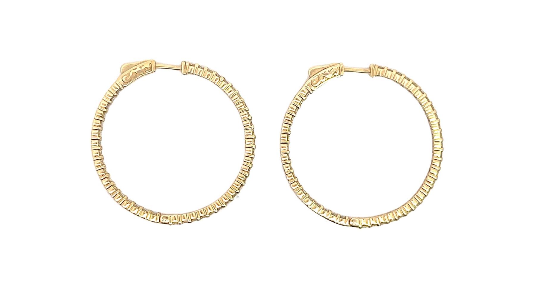One pair electronically tested 14KT yellow gold lady's combination cast & assembled fashion inside-out hoop earrings with a bright polish finish. The featured hoop earring has a diameter of 37 millimeter. Identified with markings of "14K". Condition is new, good workmanship. Containing: Eighty-Four prong set round brilliant cut diamonds, measuring 1.95 - 1.95 x 1.24mm (depth est.) approximate total weight of 84 Stones = 2.50ct. Graded in the setting. Color I - J Clarity VS-2 to SI-1 Cut Very Good Total Weight of Diamonds 2.50ct. Total Weight of Earrings 8.30gm Estimated Retail Value $ 8500.00