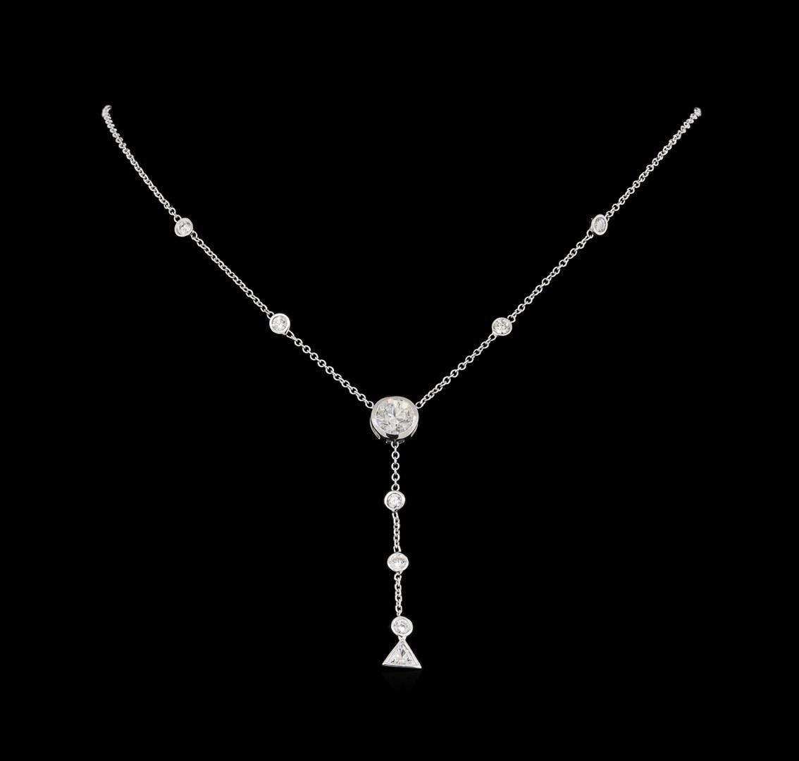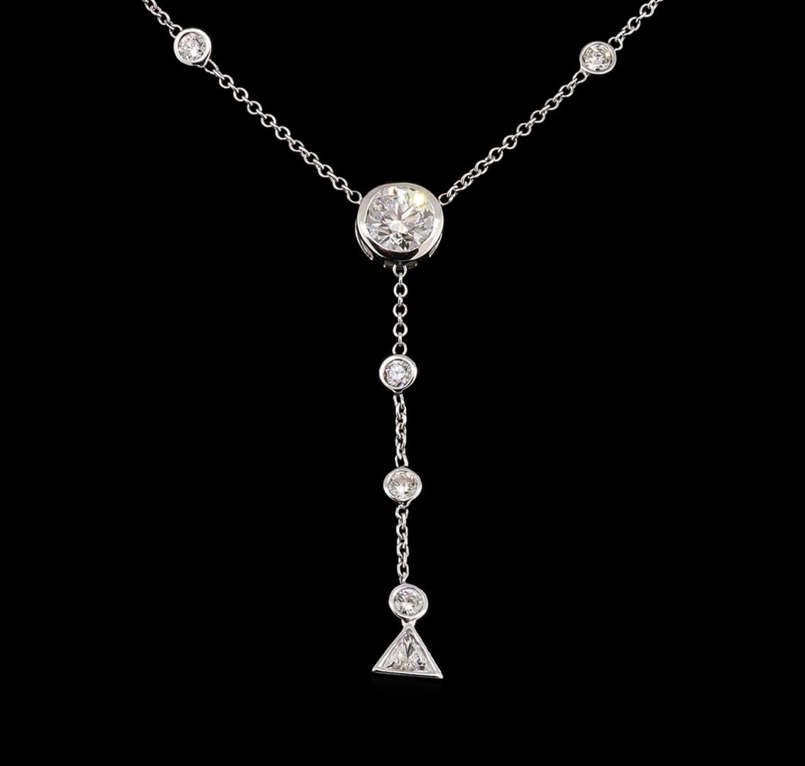 One electronically tested 14KT white gold ladies cast & assembled diamond necklace. Fifteen and one-quarter inch length necklace features a flexible one and three-quarter inch diamond station drop pendant attached to a center bezel set diamond supported by a flexible diamond station ribbon, terminating in a spring ring clasp. Bright polish finish. Identified with markings of '585'. Condition is good. Containing: One bezel set round brilliant cut diamond, measuring 7.10 - 7.00 x 4.65mm (depth est.), 6.00.%. GTCF approximate weight of 1.51ct. Graded in the setting. Clarity I-1. Color: H Depth 66.0%. Table: 53.9%. Seven bezel set round brilliant cut diamonds, measuring 3.10 - 3.00 x 1.83mm (depth est.) approximate total weight of 7 Stones = 0.75ct. Graded in the setting. Clarity I-1. Color: G - I One bezel set triangle brilliant cut diamond, measuring 5.40 x 5.00 x 1.50mm (depth est.) approximate weight of 0.24ct. Graded in the setting. Clarity SI-2. Color: H. Total Weight of Diamonds 2.50ct.. Total Weight of Necklace 4.56gm. AIG Appraised at $19,945.00.