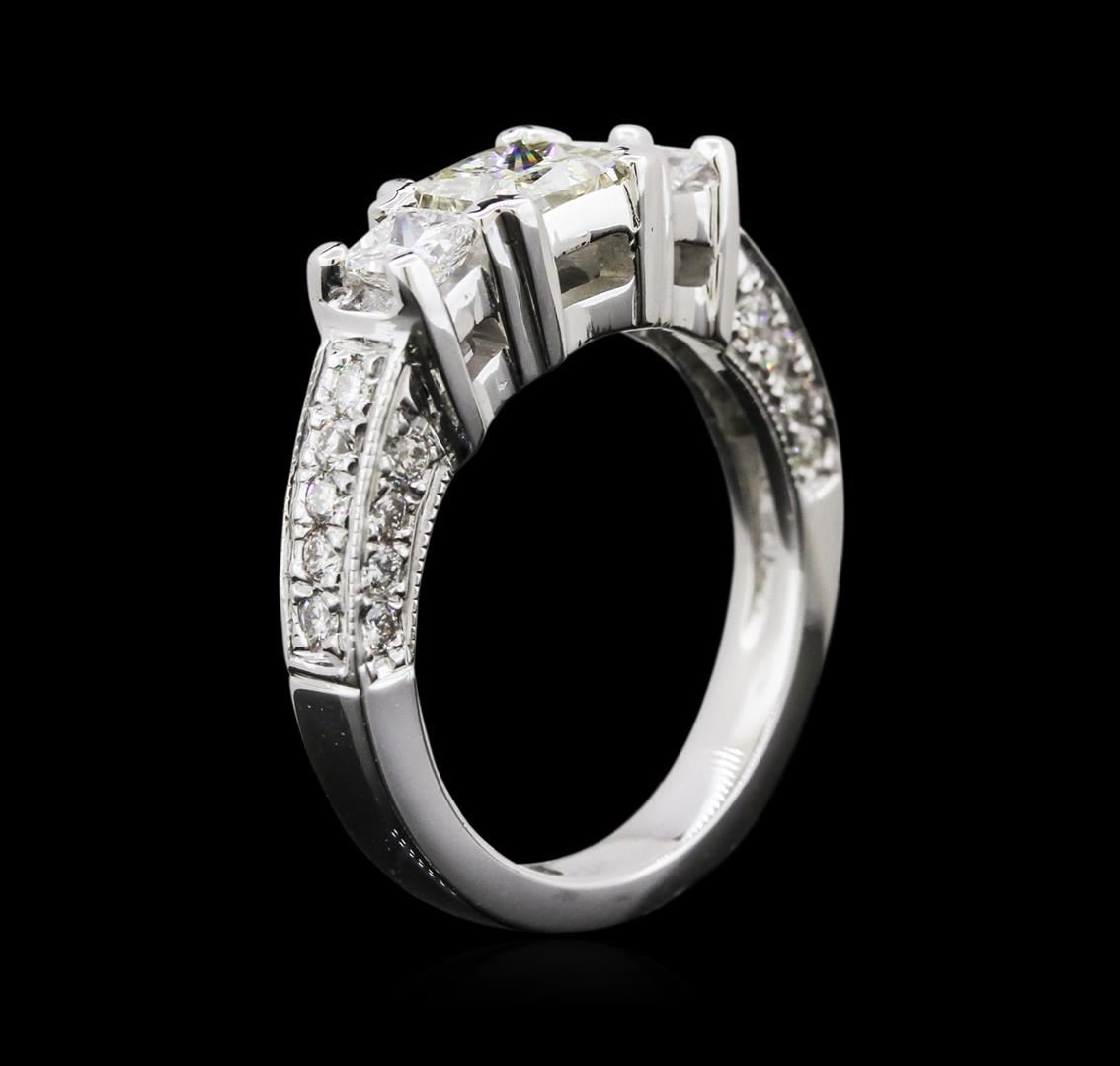 One electronically tested 14KT white gold lady's cast 3-stone wedding ring with a bright polish with milgrain detailing finish. The featured lady's ring has a shank measuring 3.34 millimeters wide. Identified with markings of "14K". Condition is new, good workmanship. Containing: One prong set princess cut diamond, measuring 5.70 x 5.30 x 3.98mm (depth est.) approximate weight of 1.00ct. Graded in the setting. Clarity: SI-2. Color: Very Good Two prong set princess cut diamonds, measuring 4.00 x 3.85 x 2.89mm (depth est.) approximate total weight of 2 Stones = 0.75ct. Graded in the setting. Clarity: VS-2 to SI-1. Color: H - I. Cut Very Good Twenty-Six prong set round brilliant cut diamonds, measuring 2.00 - 1.80 x 1.23mm (depth est.) approximate total weight of 26 Stones = 0.75ct. Graded in the setting. Clarity: VS-2 to SI-2. Color: G - I. Cut Good. Total Weight of Diamonds 2.50ct. Total Weight of Wedding Ring 7.80gm. GAS Appraised at $12,805.00.