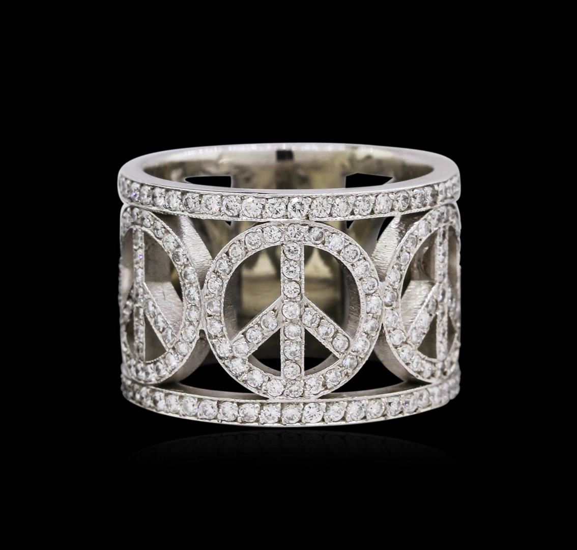 One electronically tested 14KT white gold lady's cast fashion ring with a wide band with a bright polish with milgrain detailing finish. Condition is new, good workmanship. The featured lady's ring has five connecting peace sign motifs and a shank measuring 15.25 millimeters wide. Containing: Eighty-four bead set round brilliant cut diamonds, measuring 1.50 - 1.40 x 0.94mm (depth est.) approximate total weight of 84 stones = 1.00ct. Graded in the setting. Clarity: SI-1 to SI-2. Color: H-I. Cut: Good. One hundred eighty-five bead set round brilliant cut diamonds, measuring 1.30 - 1.25 x 0.81mm (depth est.) approximate total weight of 185 Stones = 1.50ct. Graded in the setting. Clarity: SI-1 to SI-2. Color: H-I. Cut: Good. Total Weight of Diamonds: 2.50ct. Total Weight of Ring: 14.50 grams. GAS Appraised at $8,280.00.