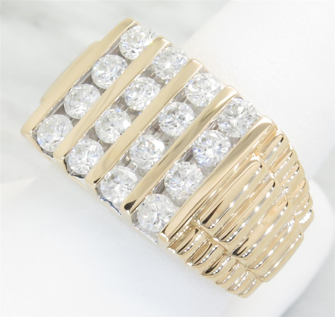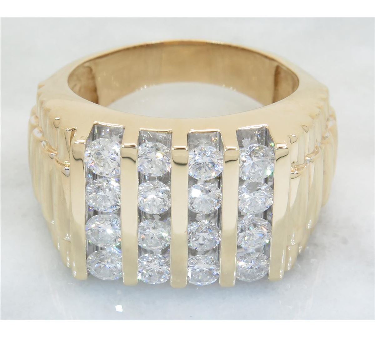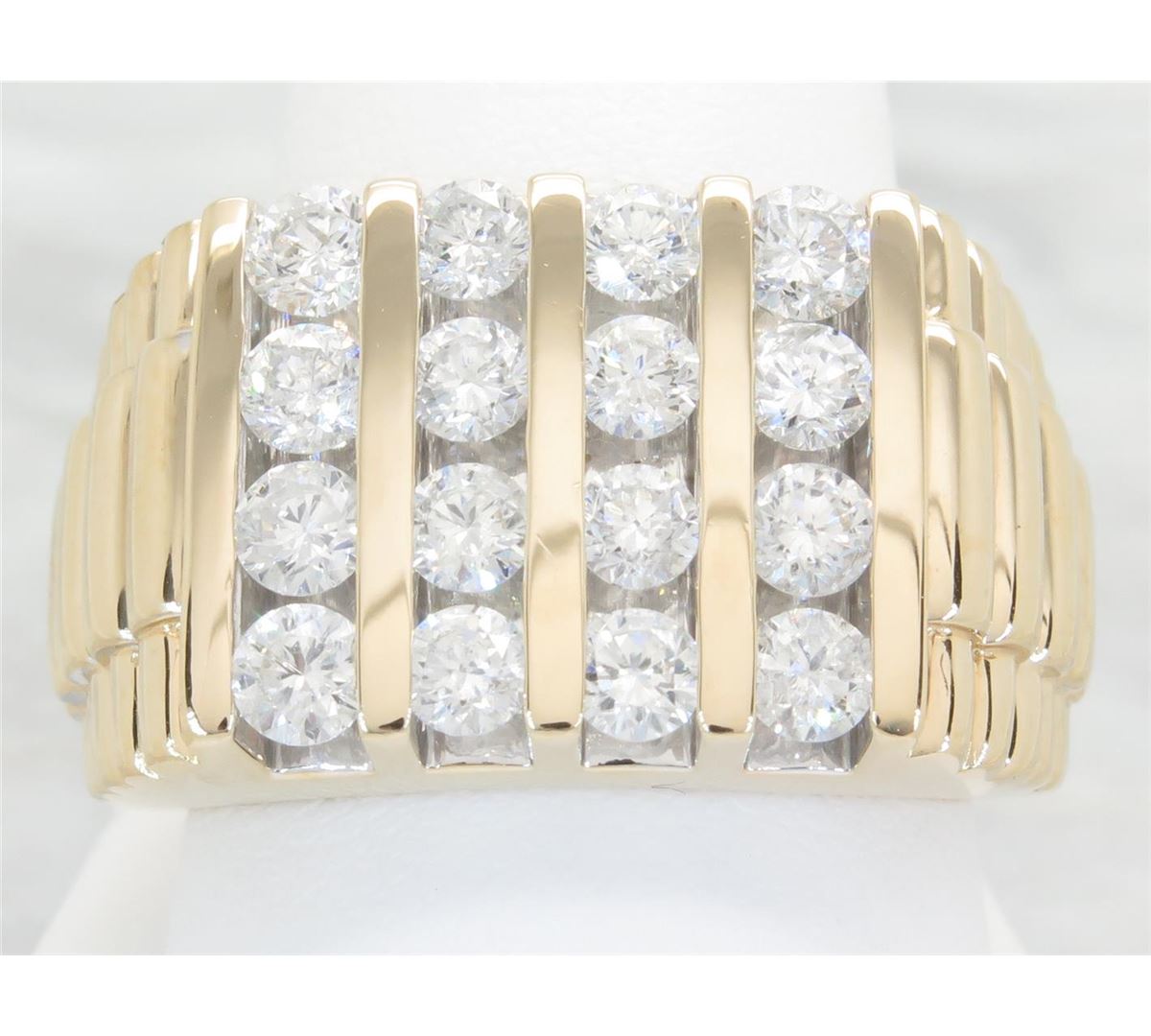 One tested 14K yellow gold diamond ring. Containing: 16 Round Brilliant Cut Diamonds. Clarity: I, Color: G-I. Approximate total diamond weight: 2.50CTW. All diamonds are graded in the mounting unless otherwise stated. Weight of ring: 14.9 grams, Size: 10.75.