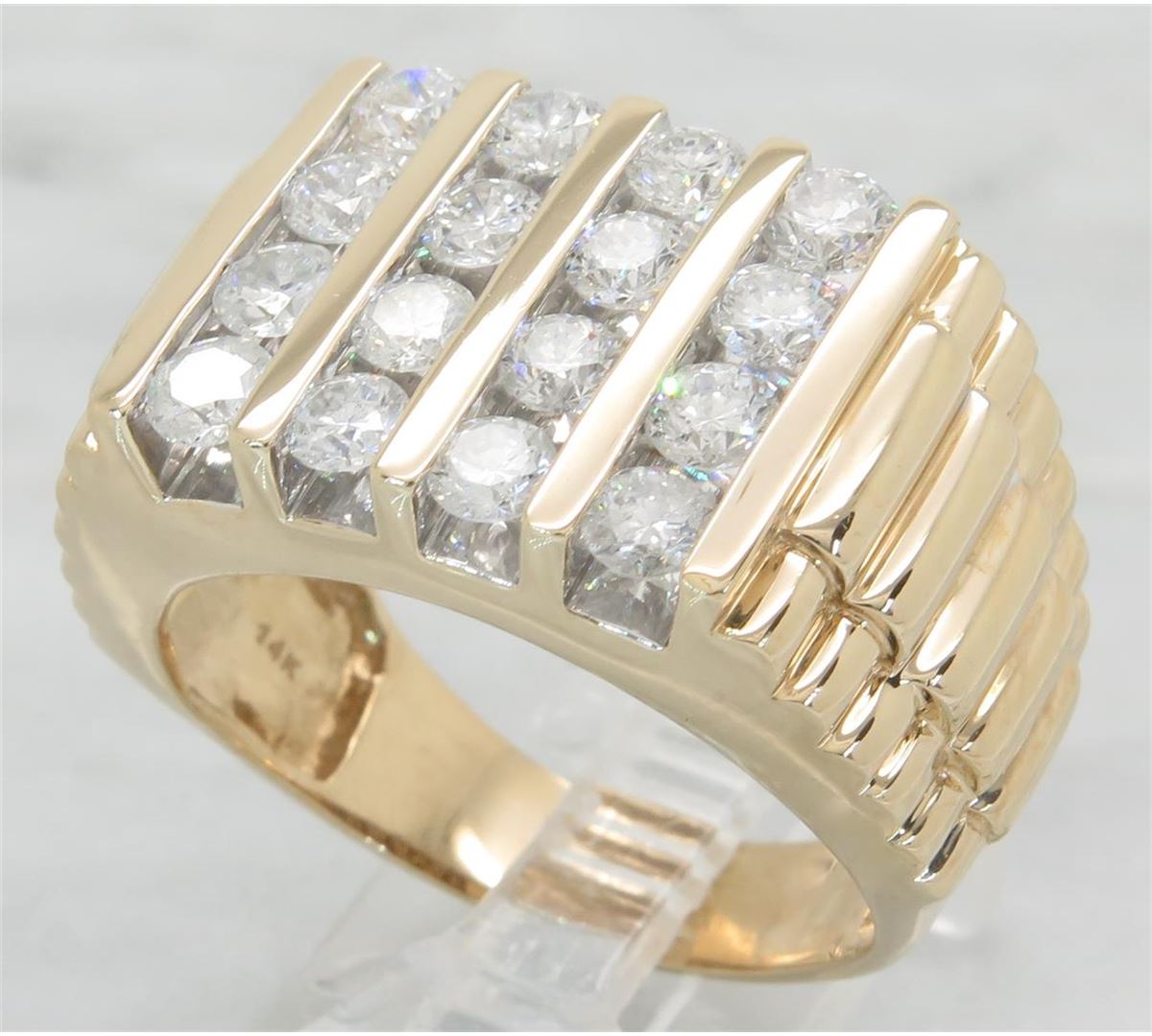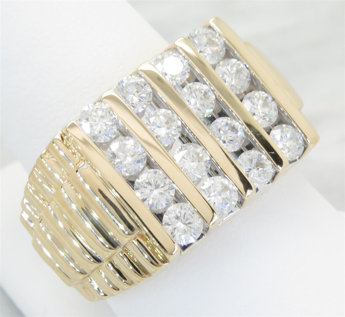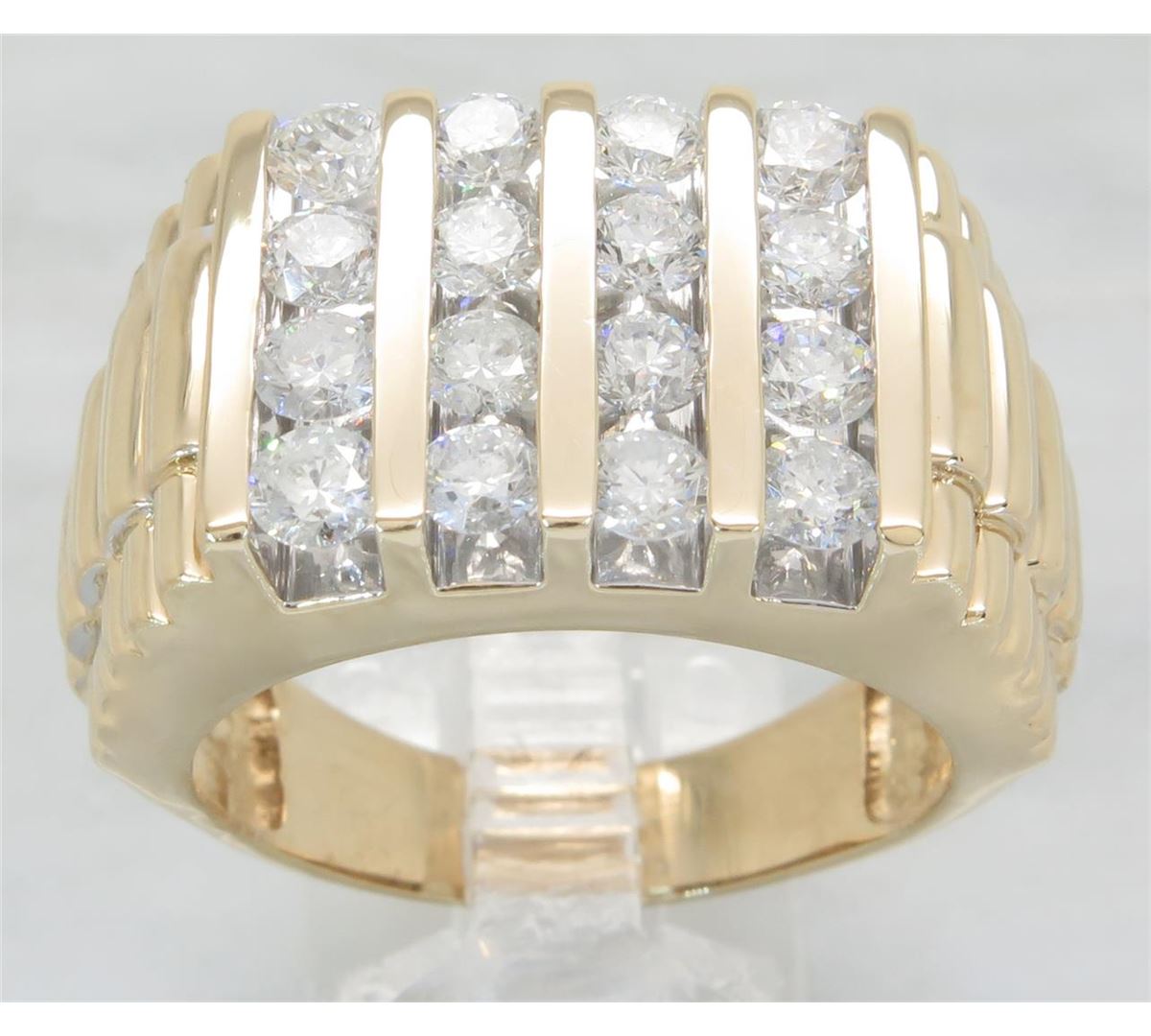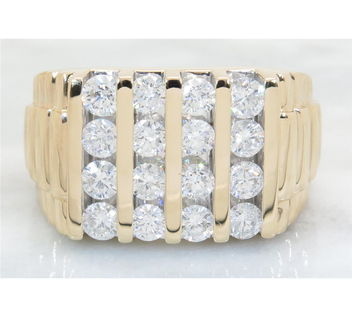 One tested 14K yellow gold diamond ring. Containing: 16 Round Brilliant Cut Diamonds. Clarity: I, Color: G-I. Approximate total diamond weight: 2.50CTW. All diamonds are graded in the mounting unless otherwise stated. Weight of ring: 14.9 grams, Size: 10.75.