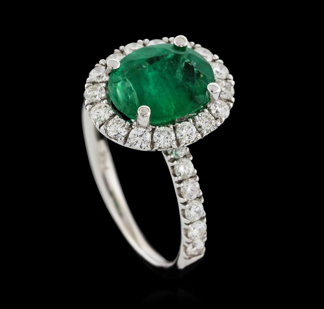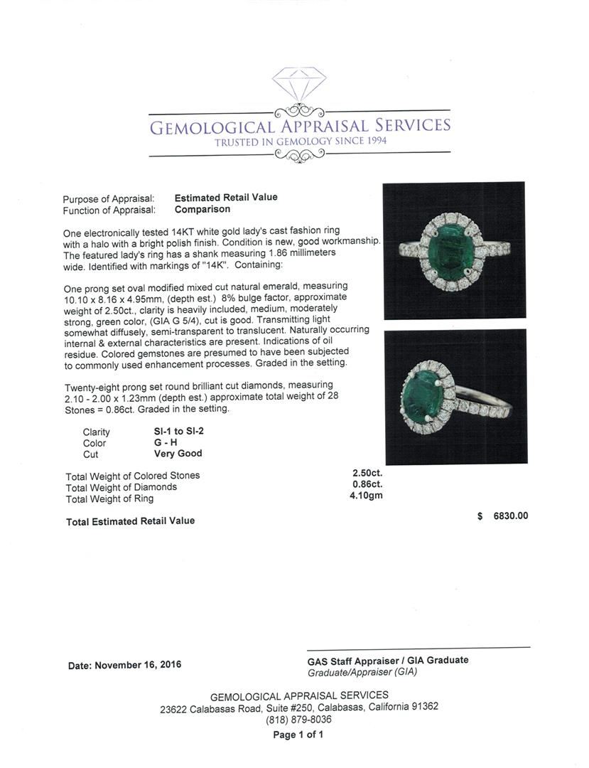 One electronically tested 14KT white gold lady's cast fashion ring with a halo with a bright polish finish. The featured lady's ring has a shank measuring 1.86 millimeters wide. Identified with markings of '14K'. Condition is new, good workmanship. Containing: One prong set oval modified mixed cut natural emerald, measuring 10.10 x 8.16 x 4.95mm, (depth est.) 8%. bulge factor, approximate weight of 2.50ct., clarity is heavily included, medium, moderately strong, green color, (GIA G 5/4), cut is good. Transmitting light somewhat diffusely, semi-transparent to translucent. Naturally occurring internal & external characteristics are present. Indications of oil residue. Colored gemstones are presumed to have been subjected to commonly used enhancement processes. Graded in the setting. Twenty-Eight prong set round brilliant cut diamonds, measuring 2.10 - 2.00 x 1.23mm (depth est.) approximate total weight of 28 Stones = 0.86ct. Graded in the setting. Clarity SI-1 to SI-2. Color: G - H Cut Very Good. Total Weight of Colored Stones 2.50ct.. Total Weight of Diamonds 0.86ct.. Total Weight of Ring 4.10gm. GAS Appraised at $6,830.00.