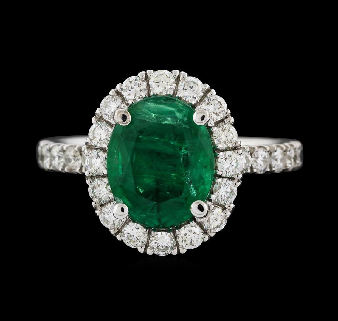 One electronically tested 14KT white gold lady's cast fashion ring with a halo with a bright polish finish. The featured lady's ring has a shank measuring 1.86 millimeters wide. Identified with markings of '14K'. Condition is new, good workmanship. Containing: One prong set oval modified mixed cut natural emerald, measuring 10.10 x 8.16 x 4.95mm, (depth est.) 8%. bulge factor, approximate weight of 2.50ct., clarity is heavily included, medium, moderately strong, green color, (GIA G 5/4), cut is good. Transmitting light somewhat diffusely, semi-transparent to translucent. Naturally occurring internal & external characteristics are present. Indications of oil residue. Colored gemstones are presumed to have been subjected to commonly used enhancement processes. Graded in the setting. Twenty-Eight prong set round brilliant cut diamonds, measuring 2.10 - 2.00 x 1.23mm (depth est.) approximate total weight of 28 Stones = 0.86ct. Graded in the setting. Clarity SI-1 to SI-2. Color: G - H Cut Very Good. Total Weight of Colored Stones 2.50ct.. Total Weight of Diamonds 0.86ct.. Total Weight of Ring 4.10gm. GAS Appraised at $6,830.00.