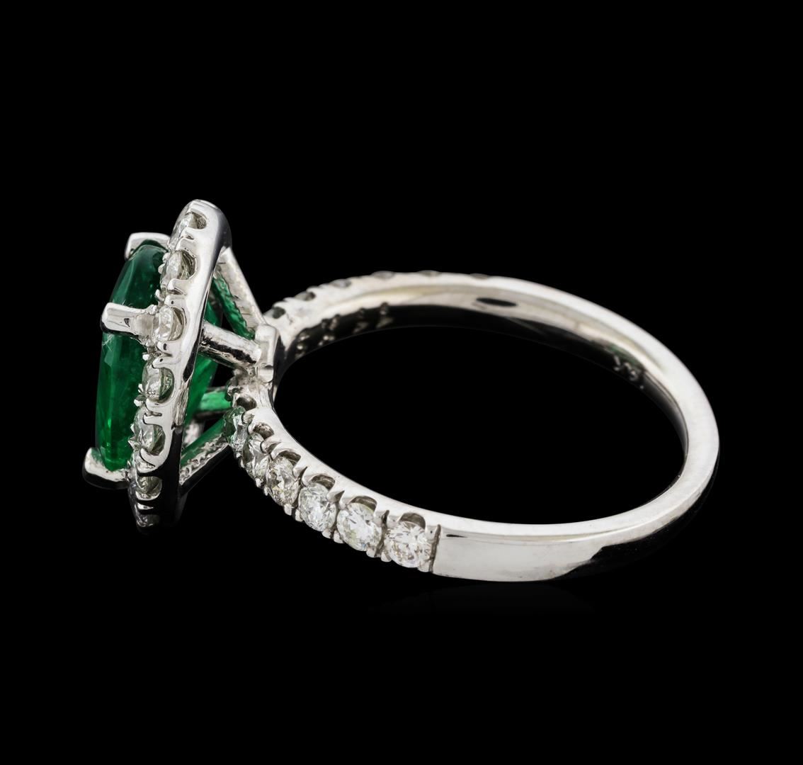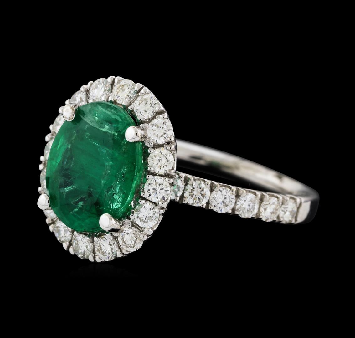 One electronically tested 14KT white gold lady's cast fashion ring with a halo with a bright polish finish. The featured lady's ring has a shank measuring 1.86 millimeters wide. Identified with markings of '14K'. Condition is new, good workmanship. Containing: One prong set oval modified mixed cut natural emerald, measuring 10.10 x 8.16 x 4.95mm, (depth est.) 8%. bulge factor, approximate weight of 2.50ct., clarity is heavily included, medium, moderately strong, green color, (GIA G 5/4), cut is good. Transmitting light somewhat diffusely, semi-transparent to translucent. Naturally occurring internal & external characteristics are present. Indications of oil residue. Colored gemstones are presumed to have been subjected to commonly used enhancement processes. Graded in the setting. Twenty-Eight prong set round brilliant cut diamonds, measuring 2.10 - 2.00 x 1.23mm (depth est.) approximate total weight of 28 Stones = 0.86ct. Graded in the setting. Clarity SI-1 to SI-2. Color: G - H Cut Very Good. Total Weight of Colored Stones 2.50ct.. Total Weight of Diamonds 0.86ct.. Total Weight of Ring 4.10gm. GAS Appraised at $6,830.00.