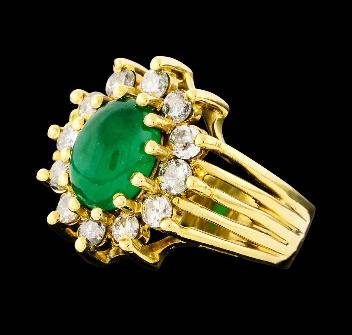 One electronically tested 14KT yellow gold lady's cast fashion ring with a five row wide band split shank with a bright polish finish. The featured lady's ring has a basket halo and a shank measuring 5.45 millimeters wide. Identified with markings of '14K'. Condition is used, good workmanship. Containing: One prong set oval cabochon cut natural emerald, measuring 10.20 x 7.10 x 4.70mm, (depth est.) approximate weight of 2.50ct., clarity is heavily included, medium, moderately strong, green color, (GIA G 5/4), cut is very good. Transmitting light somewhat diffusely, semi-transparent to translucent. Indications of oil residue. Naturally occurring internal & external characteristics are present. Colored gemstones are presumed to have been subjected to commonly used enhancement processes. Graded in the setting. Twelve prong set round brilliant cut diamonds, measuring 3.10 - 2.90 x 1.86mm (depth est.) approximate total weight of 12 Stones = 1.25ct. Graded in the setting. Clarity I-1. Color: I - J Cut Good. Total Weight of Colored Stones 2.50ct.. Total Weight of Diamonds 1.25ct.. Total Weight of Ring 8.50gm. GAS Appraised at $4,365.00.