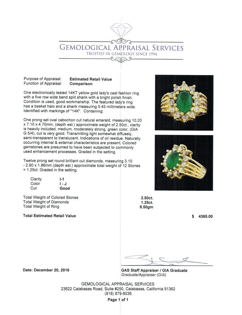 One electronically tested 14KT yellow gold lady's cast fashion ring with a five row wide band split shank with a bright polish finish. The featured lady's ring has a basket halo and a shank measuring 5.45 millimeters wide. Identified with markings of '14K'. Condition is used, good workmanship. Containing: One prong set oval cabochon cut natural emerald, measuring 10.20 x 7.10 x 4.70mm, (depth est.) approximate weight of 2.50ct., clarity is heavily included, medium, moderately strong, green color, (GIA G 5/4), cut is very good. Transmitting light somewhat diffusely, semi-transparent to translucent. Indications of oil residue. Naturally occurring internal & external characteristics are present. Colored gemstones are presumed to have been subjected to commonly used enhancement processes. Graded in the setting. Twelve prong set round brilliant cut diamonds, measuring 3.10 - 2.90 x 1.86mm (depth est.) approximate total weight of 12 Stones = 1.25ct. Graded in the setting. Clarity I-1. Color: I - J Cut Good. Total Weight of Colored Stones 2.50ct.. Total Weight of Diamonds 1.25ct.. Total Weight of Ring 8.50gm. GAS Appraised at $4,365.00.