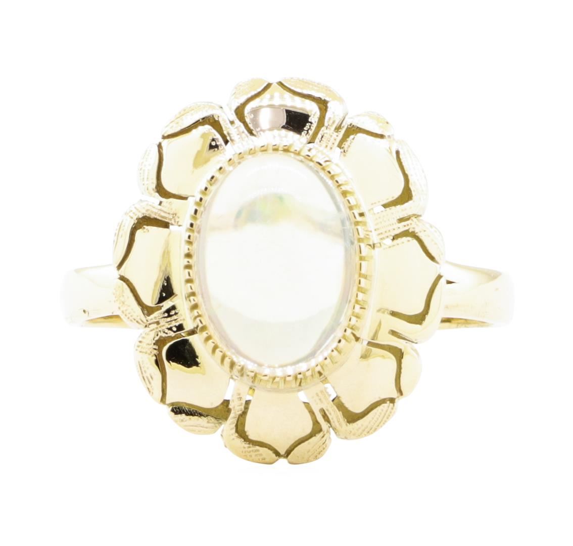 One ring featuring: 14KT yellow gold weighing 6.0 grams containing one oval cabochon crystal opal weighing 2.50 ct.