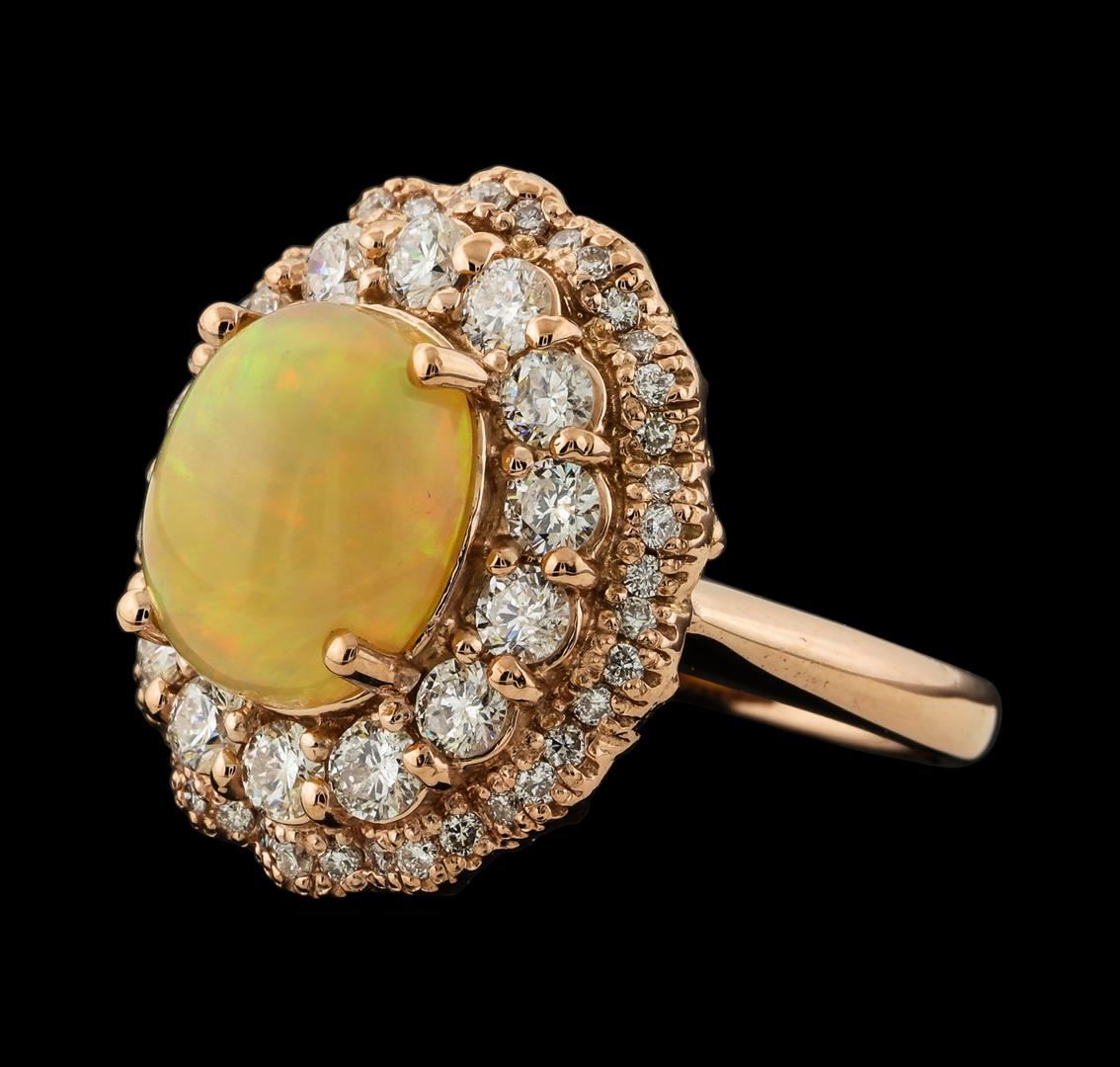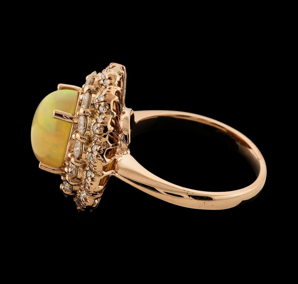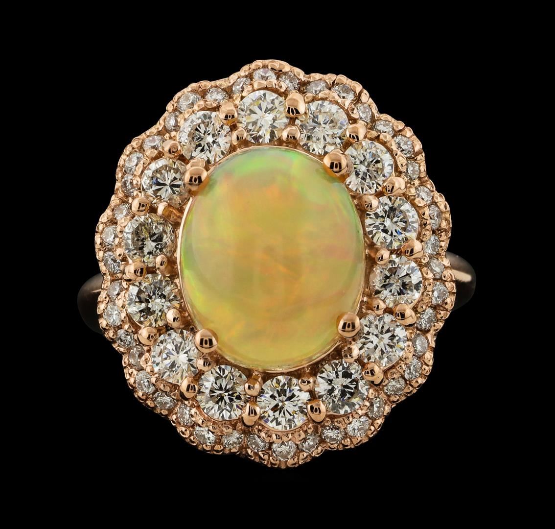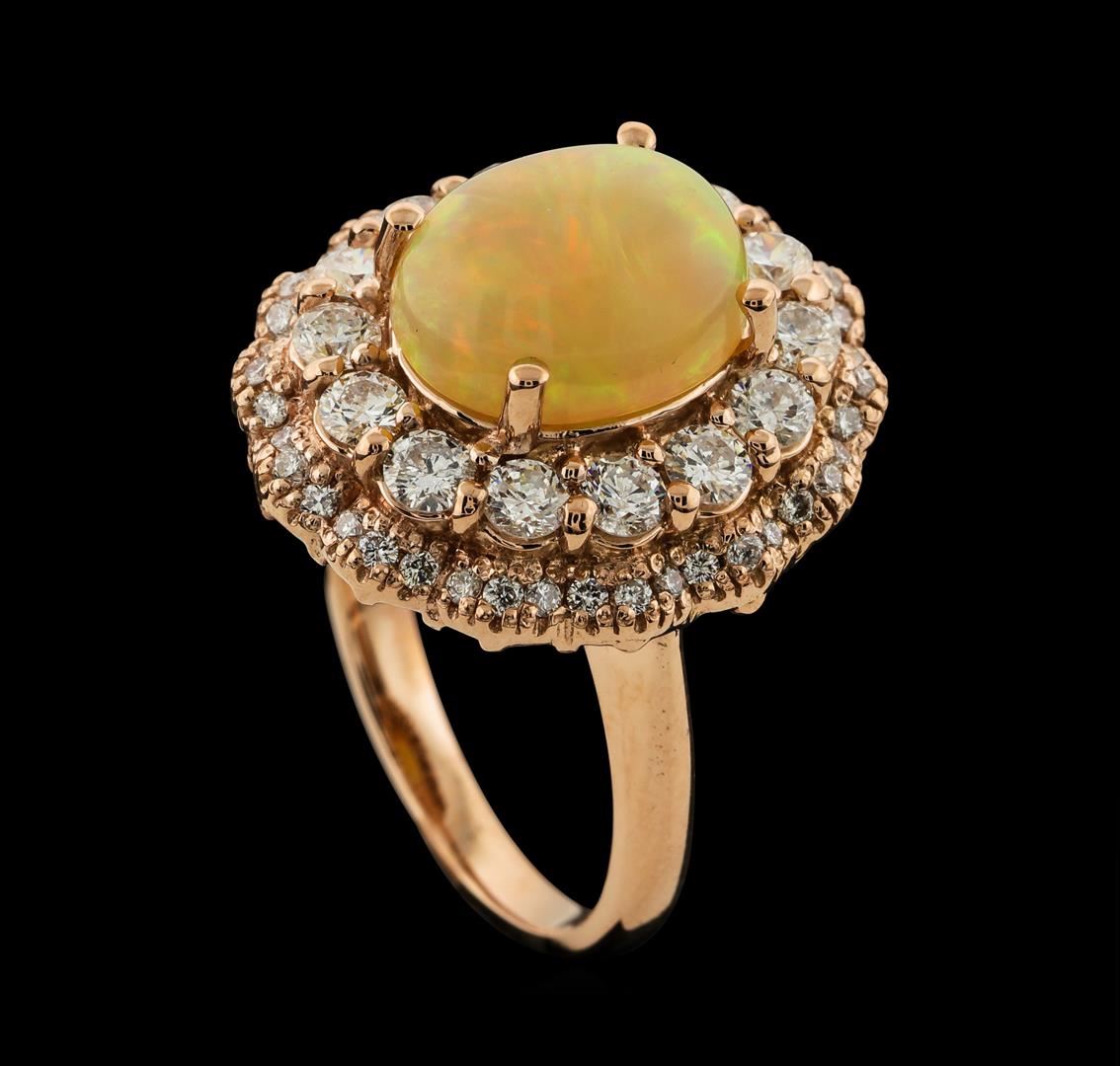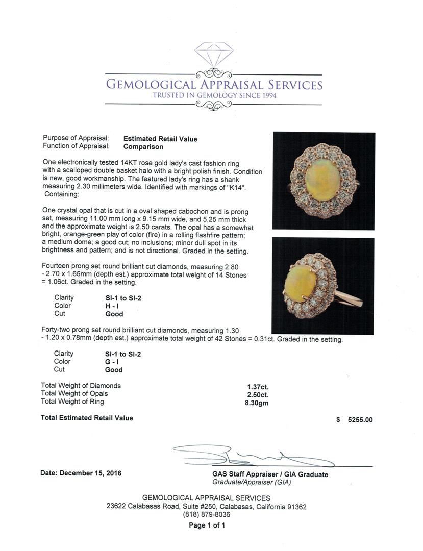One electronically tested 14KT rose gold lady's cast fashion ring with a scalloped double basket halo with a bright polish finish. The featured lady's ring has a shank measuring 2.30 millimeters wide. Identified with markings of 'K14'. Condition is new, good workmanship. Containing: One crystal opal that is cut in a oval shaped cabochon and is prong set, measuring 11.00 mm long x 9.15 mm wide, and 5.25 mm thick and the approximate weight is 2.50 carats. The opal has a somewhat bright, orange-green play of color (fire) in a rolling flashfire pattern; a medium dome; a good cut; no inclusions; minor dull spot in its brightness and pattern; and is not directional. Graded in the setting. Fourteen prong set round brilliant cut diamonds, measuring 2.80 - 2.70 x 1.65mm (depth est.) approximate total weight of 14 Stones = 1.06ct. Graded in the setting. Clarity SI-1 to SI-2. Color: H - I Cut Good Forty-Two prong set round brilliant cut diamonds, measuring 1.30 - 1.20 x 0.78mm (depth est.) approximate total weight of 42 Stones = 0.31ct. Graded in the setting. Clarity SI-1 to SI-2. Color: G - I Cut Good. Total Weight of Diamonds 1.37ct.. Total Weight of Opals 2.50ct.. Total Weight of Ring 8.30gm. GAS Appraised at $5,255.00.